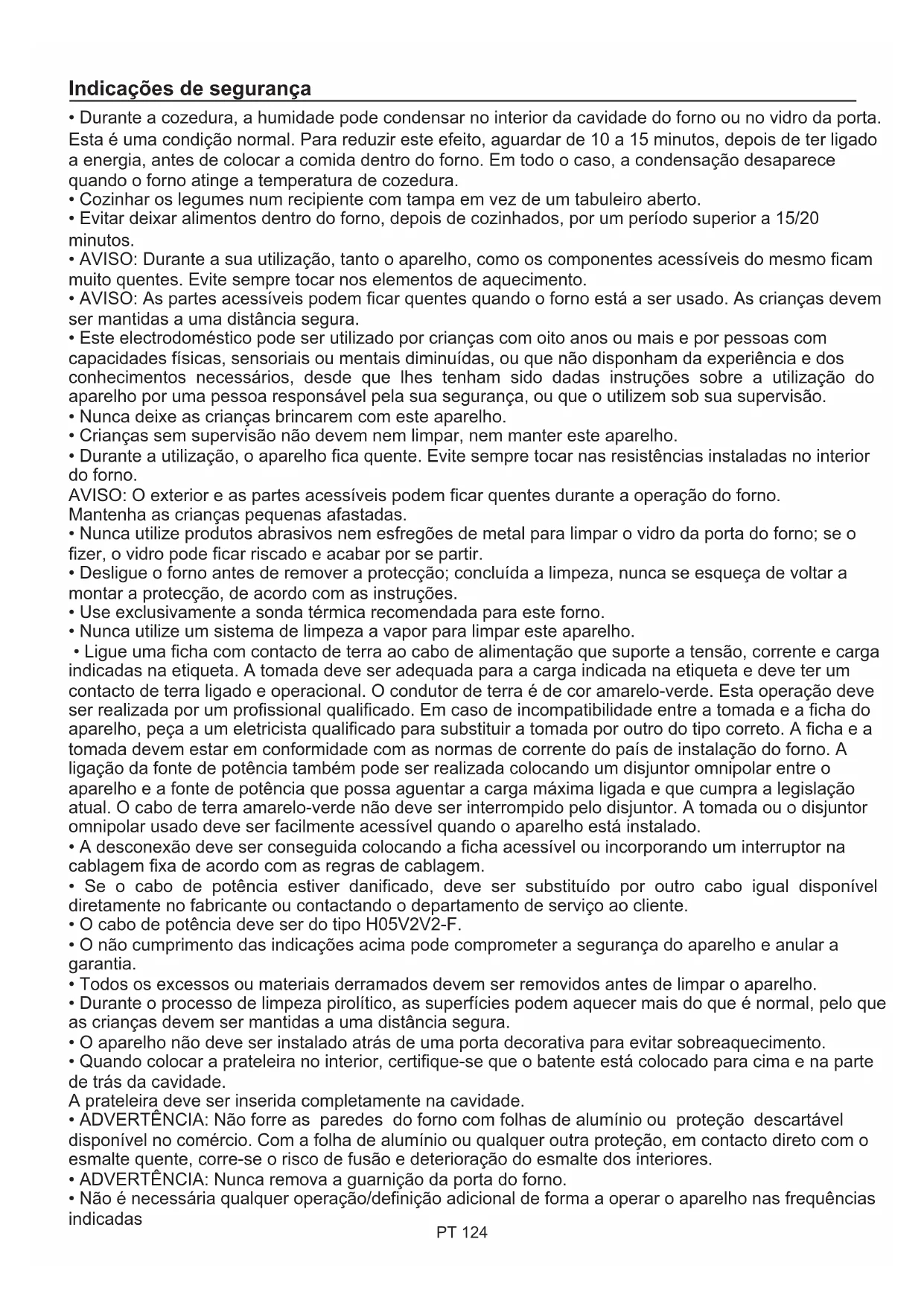 - A desconexão deve ser conseguida colocando a ficha acessível ou incorporando um interruptor na cablagem fixa de acordo com as regras de cablagem. Indicações de segurança PT 124Índice Instruções gerais