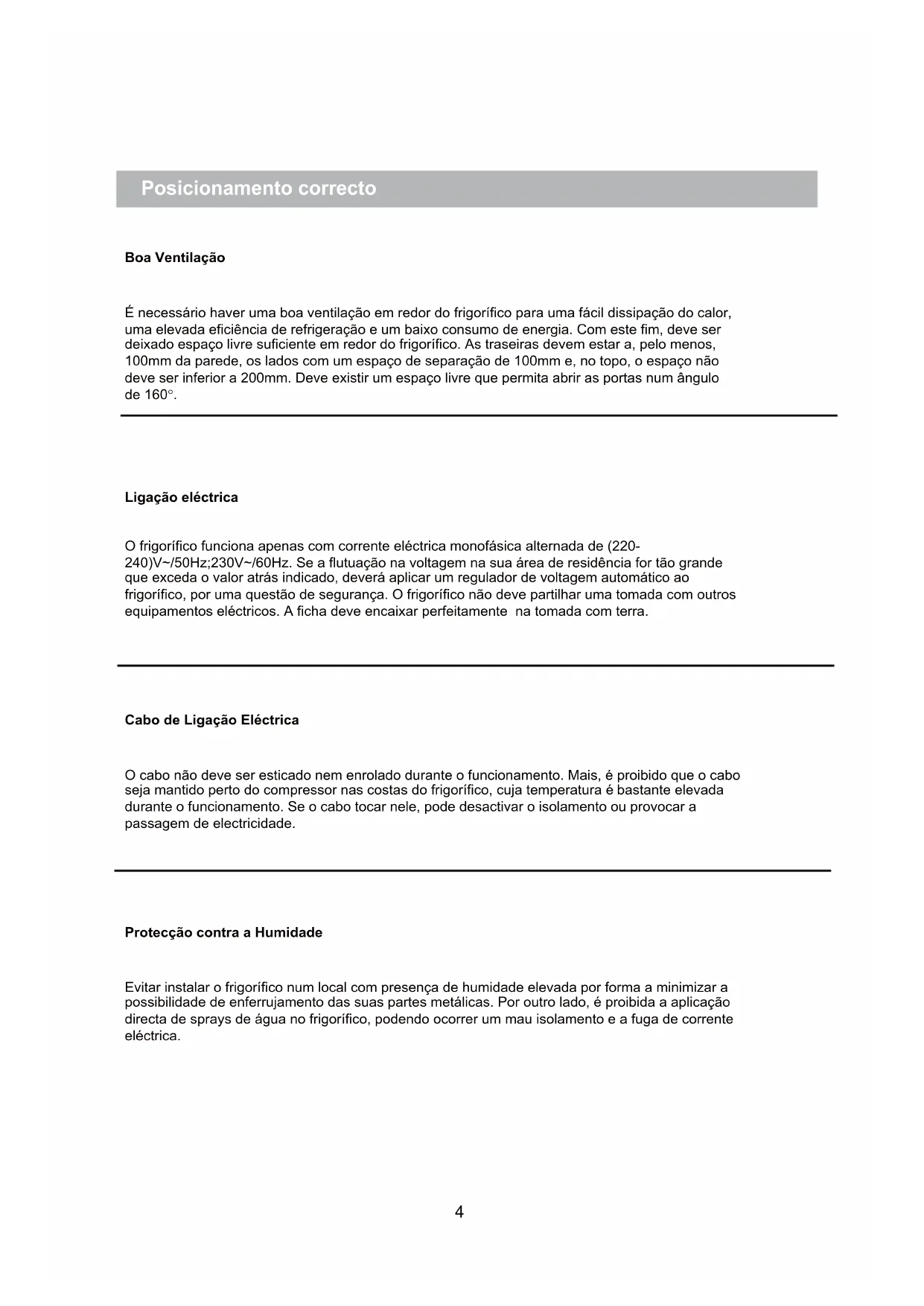 Evitar instalar o frigorífico num local com presença de humidade elevada por forma a minimizar a possibilidade de enferrujamento das suas partes metálicas. Por outro lado, é proibida a aplicação directa de sprays de água no frigorífico, podendo ocorrer um mau isolamento e a fuga de corrente eléctrica. Posicionamento correcto