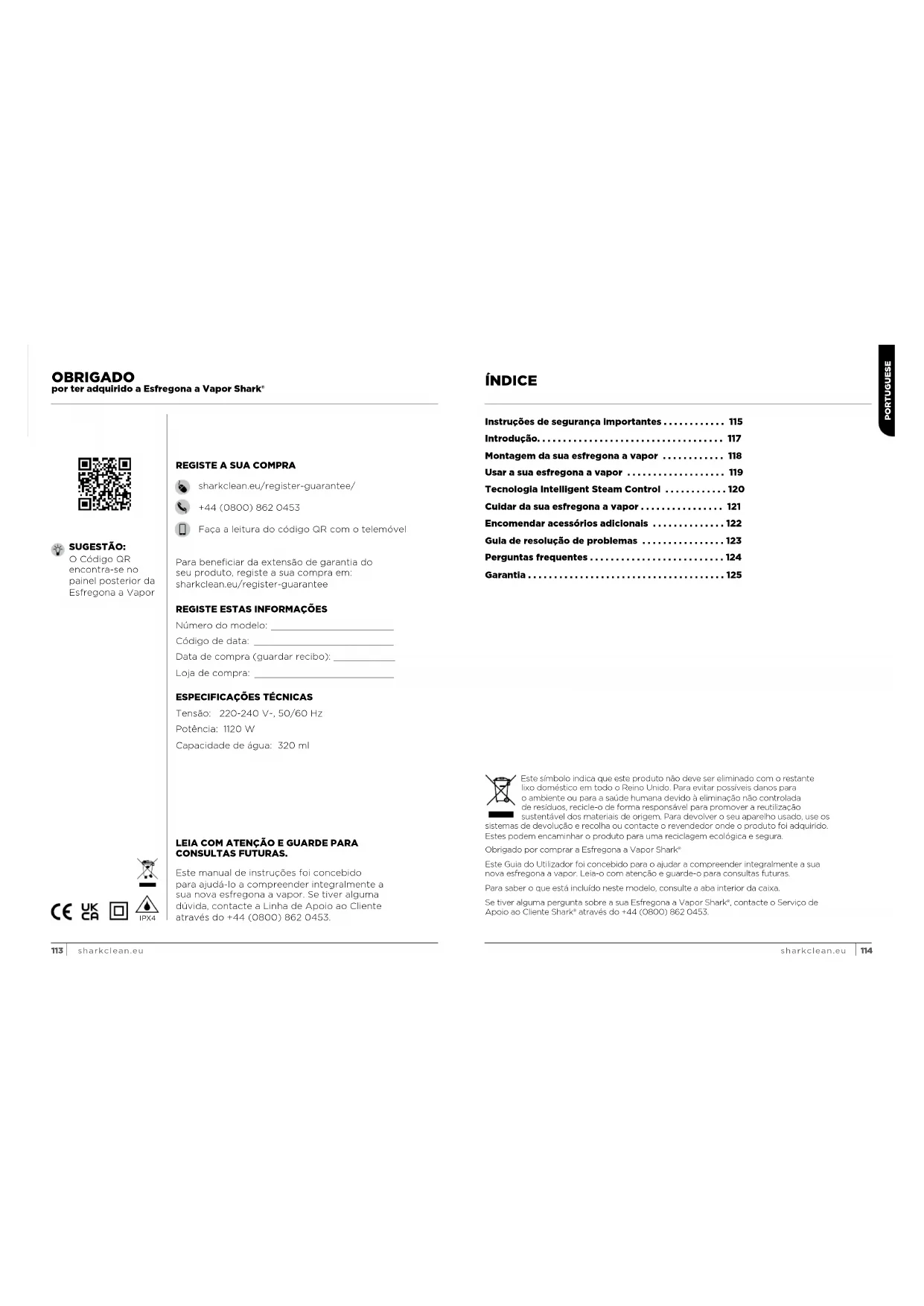 sharkclean.eu/register-guarantee/ +44 (0800) 862 0453 Faça a leitura do código QR com o telemóvel Este símbolo indica que este produto não deve ser eliminado com o restante lixo doméstico em todo o Reino Unido. Para evitar possíveis danos para o ambiente ou para a saúde humana devido à eliminação não controlada de resíduos, recicle-o de forma responsável para promover a reutilização sustentável dos materiais de origem. Para devolver o seu aparelho usado, use os sistemas de devolução e recolha ou contacte o revendedor onde o produto foi adquirido. Estes podem encaminhar o produto para uma reciclagem ecológica e segura. Obrigado por comprar a Esfregona a Vapor Shark® Este Guia do Utilizador foi concebido para o ajudar a compreender integralmente a sua nova esfregona a vapor. Leia-o com atenção e guarde-o para consultas futuras. Para saber o que está incluído neste modelo, consulte a aba interior da caixa. Se tiver alguma pergunta sobre a sua Esfregona a Vapor Shark®, contacte o Serviço de Apoio ao Cliente Shark® através do +44 (0800) 862 0453. IPX4 SUGESTÃO: O Código QR encontra-se no painel posterior da Esfregona a VaporAVISO Este aparelho NÃO deve ser usado por pessoas com capacidades físicas, sensoriais ou mentais reduzidas, ou com falta de experiência e conhecimento, exceto se tiverem recebido supervisão ou instruções sobre como usar o aparelho por alguém responsável pela sua segurança As crianças não devem utilizar ou brincar com o aparelho É necessária uma supervisão atenta para manter o aparelho fora do alcance das crianças durante a utilização PORTUGUESE 116sharkclean.eu115 sharkclean.eu AVISO: Perigo de queimaduras. Ovapor emitido pela esfregona a vapor é muito quente e pode provocar queimaduras. Tenha cuidado ao utilizar a esfregona a vapor. AVISO: Mantenha a esfregona a vapor afastada de crianças. AVISO: As crianças devem ser supervisionadas para garantir que não brincam com o aparelho. 1 Este aparelho pode ser usado por pessoas com capacidades físicas, sensoriais ou mentais reduzidas, ou com falta de experiência e conhecimento, caso tenham recebido supervisão ou instruções sobre como usar o aparelho em segurança e compreendam os perigos envolvidos. A limpeza e manutenção não devem ser feitas por crianças. Mantenha o aparelho e o cabo fora do alcance das crianças. NÃO permita que seja usado como um brinquedo. É necessária uma supervisão atenta quando usado perto de crianças. 2 Mantenha o aparelho fora do alcance de crianças quando estiver ligado ou aarrefecer. 3 Quando estiver a ser utilizada, NUNCA vire a esfregona a vapor de lado ou diretamente em direção a pessoas, animais ou plantas. O líquido ou vapor não deve ser direcionado para equipamentos que contenham componentes elétricos, como o interior dos fornos. 4 A abertura de enchimento não deve ser aberta durante a utilização. 5 Utilize o sistema APENAS para a sua finalidade prevista. 6 NÃO utilize para aquecer uma divisão. 7 NÃO utilize no exterior. 8 NÃO deixe a esfregona a vapor sem vigilância quando estiver ligada à corrente. Desligue SEMPRE o cabo de alimentação da tomada elétrica quando não estiver a ser utilizada e antes de proceder à manutenção. 9 NÃO permita que a esfregona a vapor seja utilizada por crianças. É necessária atenção especial quando usada perto de crianças, animais de estimação ouplantas. 10 Utilize APENAS do modo descrito neste manual de instruções. 11 Utilize APENAS acessórios recomendados pelo fabricante. 12 NÃO utilize se o cabo ou a ficha estiverem danificados. Se a esfregona a vapor não estiver a funcionar como deveria ou tiver caído, sido danificada, deixada no exterior ou submersa em água, devolva-a à SharkNinja Europe Limited para avaliação e reparação. Aremontagem ou reparação incorretas podem causar um risco de choque elétrico ou ferimentos quando a esfregona a vapor for utilizada. 13 Para proteger contra o risco de choque elétrico, NÃO mergulhe a esfregona a vapor em água ou em qualquer outrolíquido. 14 NÃO manuseie a ficha ou a esfregona a vapor com as mãos molhadas nem a utilize sem usar sapatos. 15 NÃO puxe ou transporte pelo cabo, use o cabo como pega, feche uma porta sobre o cabo ou puxe o cabo em torno de arestas ou cantos afiados. NÃO passe a esfregona a vapor por cima do cabo. Mantenha o cabo afastado de superfícies quentes. 16 NÃO desligue da tomada puxando pelo cabo de alimentação. Para desligar, segure a ficha e retire-a da tomada. NÃO utilize extensões elétricas ou tomadas com capacidade de transporte de corrente inadequada. 17 NÃO coloque quaisquer objetos nas aberturas do bocal. Interrompa a utilização se o bocal de vapor estiver entupido. 18 NÃO coloque as mãos ou os pés debaixo da esfregona a vapor, pois esta fica muito quente. 19 Utilize a esfregona APENAS em superfícies planas e horizontais. NÃO utilize em paredes, balcões ou janelas. 20 NÃO utilize em pele, móveis polidos com cera, tecidos sintéticos, veludo ou outros materiais delicados e sensíveis ao vapor. 21 NÃO adicione soluções de limpeza, vinagre, perfumes, óleos ou quaisquer outros químicos à água utilizada na esfregona a vapor. Isto pode danificar a esfregona ou tornar a sua utilização insegura. Se vive numa região de água dura, recomendamos que utilize água destilada na esfregona a vapor. 22 NUNCA armazene ou deixe a esfregona a vapor num local com a almofada Dirt Grip colocada, pois pode danificar as superfícies. 23 Antes de remover o acessório Dirt Grip, desligue a esfregona a vapor da tomada e deixe-a arrefecer. 24 Antes de limpar, desligue a esfregona a vapor da tomada. Utilize um pano seco ou húmido para limpar a parte exterior. NÃO deite água sobre a esfregona a vapor nem utilize álcool, benzeno ou diluente para a limpar. 25 Deve ter-se muito cuidado ao utilizar a esfregona a vapor para limpar escadas. 26 NUNCA utilize a esfregona a vapor sem que a a