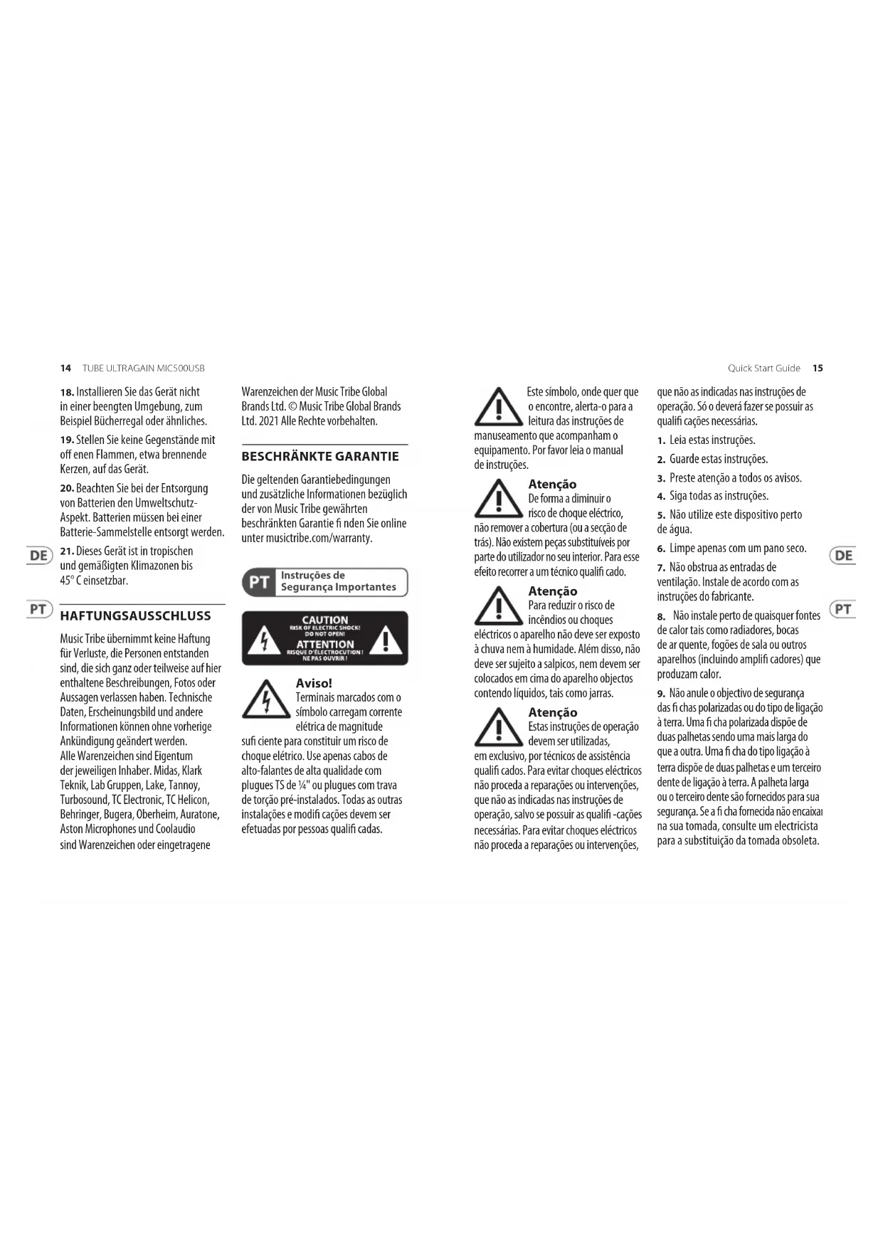 Die geltenden Garantiebedingungen und zusätzliche Informationen bezüglich der von Music Tribe gewährten beschränkten Garantie nden Sie online unter musictribe.com/warranty. Aviso! Terminais marcados com o símbolo carregam corrente elétrica de magnitude su ciente para constituir um risco de choque elétrico. Use apenas cabos de alto-falantes de alta qualidade com plugues TS de ¼" ou plugues com trava de torção pré-instalados. Todas as outras instalações e modi cações devem ser efetuadas por pessoasquali cadas. Instruções de Segurança Importantes Este símbolo, onde quer que o encontre, alerta-o para a leitura das instruções de manuseamento que acompanham o equipamento. Por favor leia o manual de instruções. Atenção De forma a diminuir o risco de choque eléctrico, não remover a cobertura (ouasecção de trás). Não existem peças substituíveis por parte do utilizador no seu interior. Para esse efeito recorrer a um técnico quali cado. Atenção Para reduzir o risco de incêndios ou choques eléctricos o aparelho não deve ser exposto à chuva nem à humidade. Além disso, não deve ser sujeito a salpicos, nem devem ser colocados em cima do aparelho objectos contendo líquidos, tais como jarras. Atenção Estas instruções de operação devem ser utilizadas, em exclusivo, por técnicos de assistência quali cados. Para evitar choques eléctricos não proceda a reparações ou intervenções, que não as indicadas nas instruções de operação, salvo se possuir as quali -cações necessárias. Para evitar choques eléctricos não proceda a reparações ou intervenções, que não as indicadas nas instruções de operação. Só o deverá fazer se possuir as quali cações necessárias.