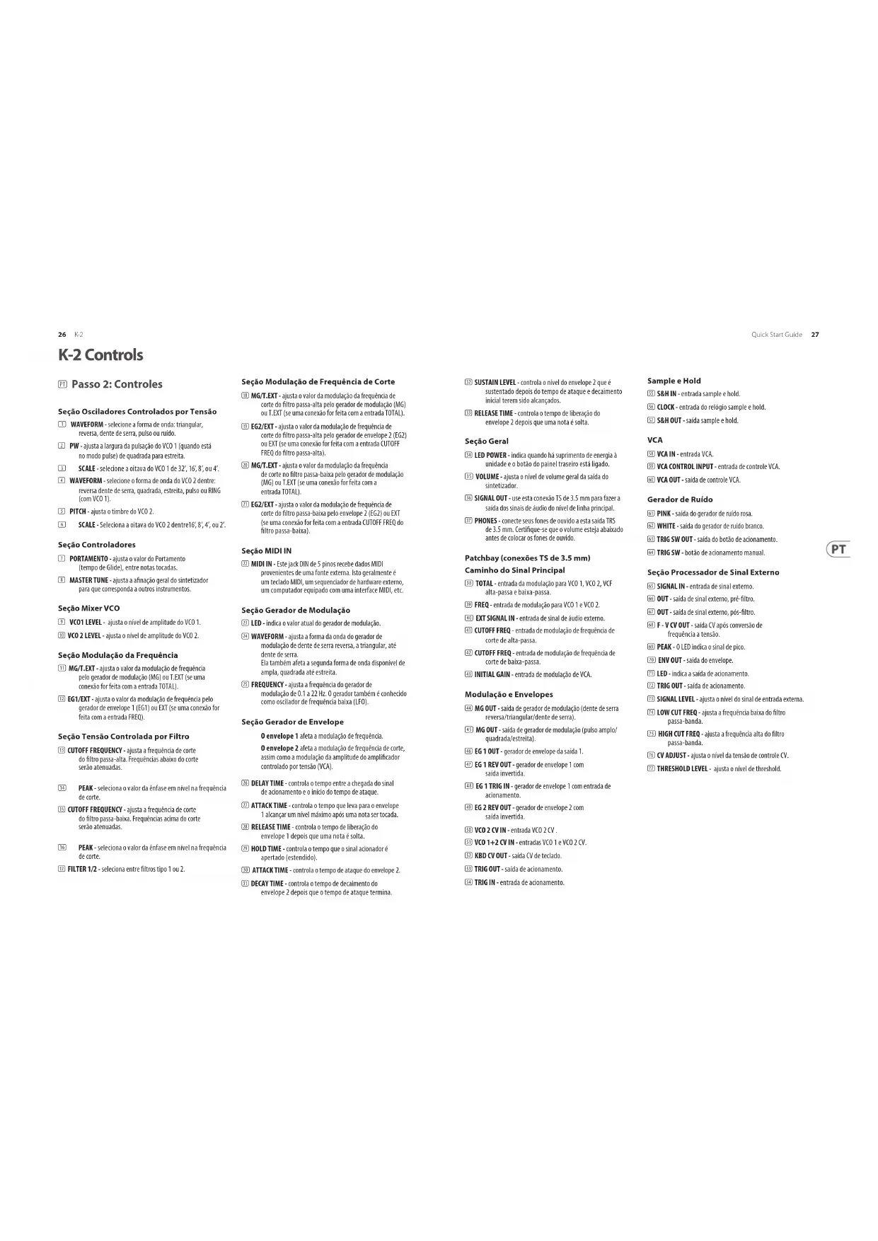 Este ‘guia de primeiros passos’ o ajudará a congurar o sintetizador analógico K-2 e brevemente apresentará suas capacidades. CONEXÃO Para conectar o K-2 ao seus sistema, favor consultar o guia de conexão apresentado anteriormente neste documento. Aviso: Não sobrecarregue as entradas de 3.5 mm. Elas só podem aceitar o nível correto de tensão conforme demonstrado nas tabelas de dados técnicos. As saídas de 3.5 mm devem apenas serem conectadas a entradas capazes de receber tensão de saída. O não cumprimento destas instruções poderá danicar o K-2 ou unidades externas.