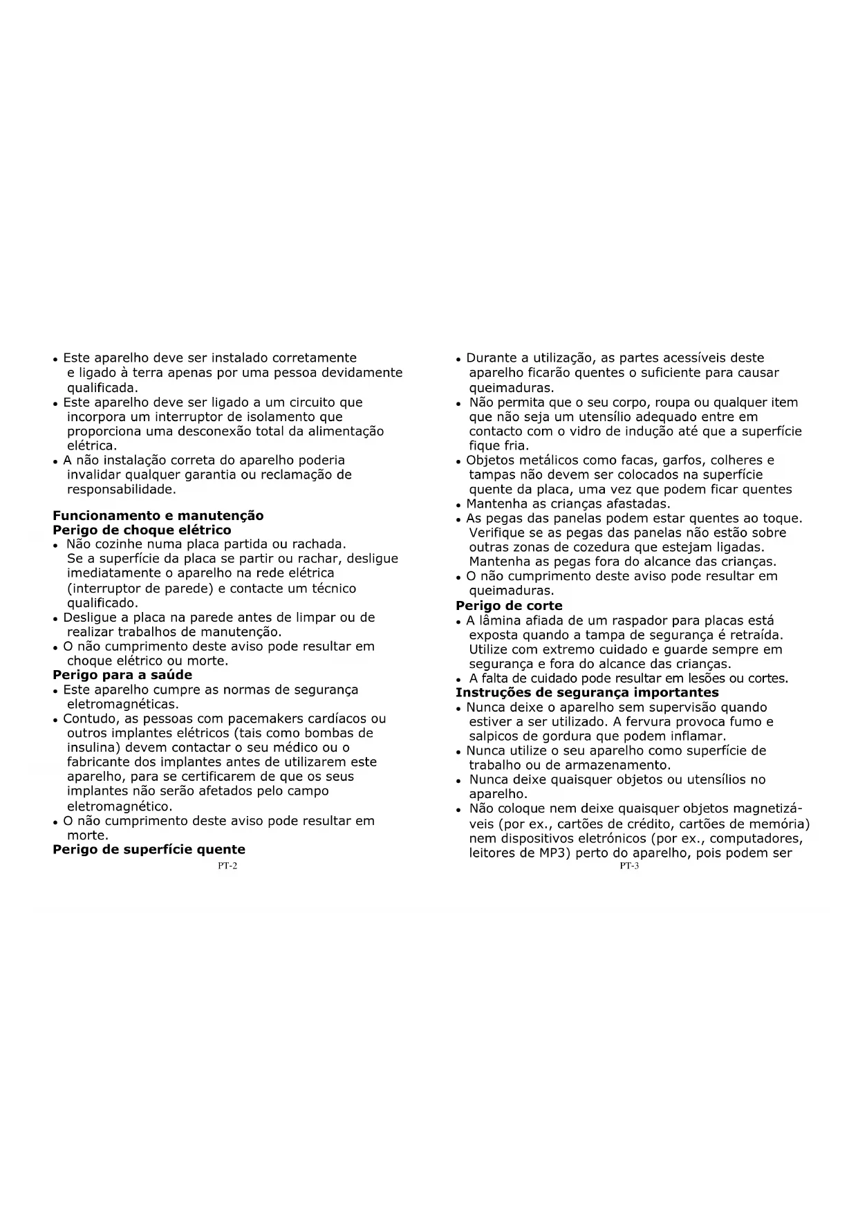 Instalação Perigo de choque elétrico ● Desligue o aparelho da alimentação elétrica de rede antes de realizar qualquer manutenção de rotina. ● A ligação a um bom sistema de ligação à terra é essencial e obrigatória. ● As alterações ao sistema de cablagem doméstico devem apenas ser feitas por um eletricista qualificado. ● O não cumprimento deste aviso pode resultar em choque elétrico ou morte. Perigo de corte ● Tenha cuidado - as arestas do painel são afiadas. ● A falta de cuidado pode resultar em lesões ou cortes. Instruções de segurança importantes ● Leia estas instruções antes de instalar ou utilizar este aparelho. ● Nenhum material ou produto combustível deve ser colocado a qualquer momento neste aparelho. ● Coloque esta informação disponível para a pessoa responsável pela instalação do aparelho, pois pode reduzir os custos de instalação. ● Para evitar um perigo, este aparelho deve ser instalado de acordo com estas instruções de instalação. Advertências de segurança A sua segurança é importante para nós. Leia esta informação antes de utilizar a sua placa.PT-2 ● Este aparelho deve ser instalado corretamente e ligado à terra apenas por uma pessoa devidamente qualificada. ● Este aparelho deve ser ligado a um circuito que incorpora um interruptor de isolamento que proporciona uma desconexão total da alimentação elétrica. ● A não instalação correta do aparelho poderia invalidar qualquer garantia ou reclamação de responsabilidade. Funcionamento e manutenção Perigo de choque elétrico ● Não cozinhe numa placa partida ou rachada. Se a superfície da placa se partir ou rachar, desligue imediatamente o aparelho na rede elétrica (interruptor de parede) e contacte um técnico qualificado. ● Desligue a placa na parede antes de limpar ou de realizar trabalhos de manutenção. ● O não cumprimento deste aviso pode resultar em choque elétrico ou morte. Perigo para a saúde ● Este aparelho cumpre as normas de segurança eletromagnéticas. ● Contudo, as pessoas com pacemakers cardíacos ou outros implantes elétricos (tais como bombas de insulina) devem contactar o seu médico ou o fabricante dos implantes antes de utilizarem este aparelho, para se certificarem de que os seus implantes não serão afetados pelo campo eletromagnético. ● O não cumprimento deste aviso pode resultar em morte. Perigo de superfície quente PT-3 ● Durante a utilização, as partes acessíveis deste aparelho ficarão quentes o suficiente para causar queimaduras. ● Não permita que o seu corpo, roupa ou qualquer item que não seja um utensílio adequado entre em contacto com o vidro de indução até que a superfície fique fria. ● Objetos metálicos como facas, garfos, colheres e tampas não devem ser colocados na superfície quente da placa, uma vez que podem ficar quentes ● Mantenha as crianças afastadas. ● As pegas das panelas podem estar quentes ao toque. Verifique se as pegas das panelas não estão sobre outras zonas de cozedura que estejam ligadas. Mantenha as pegas fora do alcance das crianças. ● O não cumprimento deste aviso pode resultar em queimaduras. Perigo de corte ● A lâmina afiada de um raspador para placas está exposta quando a tampa de segurança é retraída. Utilize com extremo cuidado e guarde sempre em segurança e fora do alcance das crianças. ● A falta de cuidado pode resultar em lesões ou cortes. Instruções de segurança importantes ● Nunca deixe o aparelho sem supervisão quando estiver a ser utilizado. A fervura provoca fumo e salpicos de gordura que podem inflamar. ● Nunca utilize o seu aparelho como superfície de trabalho ou de armazenamento. ● Nunca deixe quaisquer objetos ou utensílios no aparelho. ● Não coloque nem deixe quaisquer objetos magnetizá- veis (por ex., cartões de crédito, cartões de memória) nem dispositivos eletrónicos (por ex., computadores, leitores de MP3) perto do aparelho, pois podem serPT-4 afetados pelo seu campo eletromagnético. ● Nunca utilize o aparelho como sistema de aquecimento da divisão. ● Após a utilização, desligue sempre as zonas de cozedura e a placa como descrito neste manual (ou seja, utilizando os comandos táteis). Não confie na função de deteção de panelas para desligar as zonas de cozedura ao retirar as panelas. ● Não permita que as crianças brinquem com o aparelho ou que se sentem, fiquem de pé ou subam para este. ● Não armazene artigos de interesse para as crianças em armários por cima do aparelho. As crianças que sobem para a placa podem ficar gravemente feridas. ● Não deixe as crianças sozinhas ou desacompanhadas na área onde o aparelho está a ser utilizado. ● As crianças ou pessoas com uma deficiência que limite a sua capacidade de utilizar o aparelho devem ter uma pessoa responsável e competente para as instruir na sua utilização. O instrutor deve certificar- se de que pode utilizar o aparelho sem perigo para si próprio ou para o seu ambiente. ● Não repare nem substitua qualquer parte do aparelho, a menos que especificamente recomendado no manual. Todas as outras intervenções devem ser efetuadas por um técnico qualificado. ● Não utilize um dispositivo de limpeza a vapor para limpar a sua placa. ● Não coloque ou deixe cair objetos pesados sobre a sua placa. ● Não se coloque de pé na sua placa. ● Não utilize panelas com bordas recortadas nem arraste panelas através da superfície do vidro de indução, pois isto pode riscar o vidro. ● Não utilize esfregões nem qualquer outro agente abrasivo duro para limpar a sua placa, pois estes PT-5 podem riscar o vidro de indução. ● Se o cabo de alimentação estiver danificado, tem de ser substituído pelo fabricante, pelo agente de serviço ou por pessoas igualmente qualificadas de forma a evitar o perigo. ● Este aparelho destina-se a ser utilizado em meio doméstico e aplicações semelhantes tais como: -