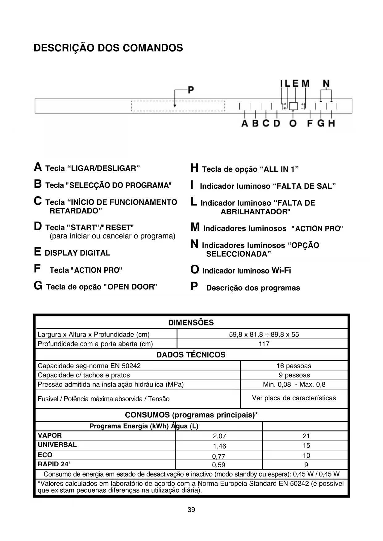 Hygiene+ 75°C VAPOR 75°C Chef 65°C Familiar 70°C UNIVERSAL 60°C Diário 55°C ECO 45°C Cristais 45°C Lavagem A 59’ 65°C RAPIDO 24' 50°C Pré-lavagem Lavagem com pré-lavagem No caso dos programas de lavagem com pré-lavagem, é aconselhável adicionar uma segunda dose de detergente (máximo de 10 g), a ser directamente colocada no interior da máquina. Ciclo com acção alternada de vapor e jactos de água. Efectivo em amaciar e remover sujidade seca e bactérias, sem a necessidade de pré- lavar pratos e tachos. Adequado para lavagem diária, imediatamente após a refeição, de loiças e tachos com sujidade normal (MÁXIMO 8 peças). Ciclo super-rápido que se efectua no final da refeição, indicado para cargas pequenas (4/6 pessoas). Adequado para lavar a loiça delicada e decorada, assim como os cristais. Indicado também para lavagem diária de loiça pouco suja, exceptuando as frigideiras. Pré-lavagem rápida para a loiça usada pela manhã ou pelo almoço, quando se quer realizar apenas uma lavagem depois do jantar. Adequado para lavar a loiça e tachos com sujidade normal. Programa para a loiça do dia-a-dia normalmente suja (o mais eficiente em termos da combinação dos consumos de energia e água para o tipo de loiça referido). Programa segundo normas EN 50242. Ciclo antibacteriano, para lavar e esterilizar pratos (mesmo que muito sujos), biberões, etc. Para a lavagem rápida de loiça muito suja. Para a lavagem quotidiana. Dois enxaguamentos finais asseguram um nível elevado de higiene e limpeza. Ciclo rápido, para loiça “normalmente” suja; para lavagens frequentes e cargas normais.