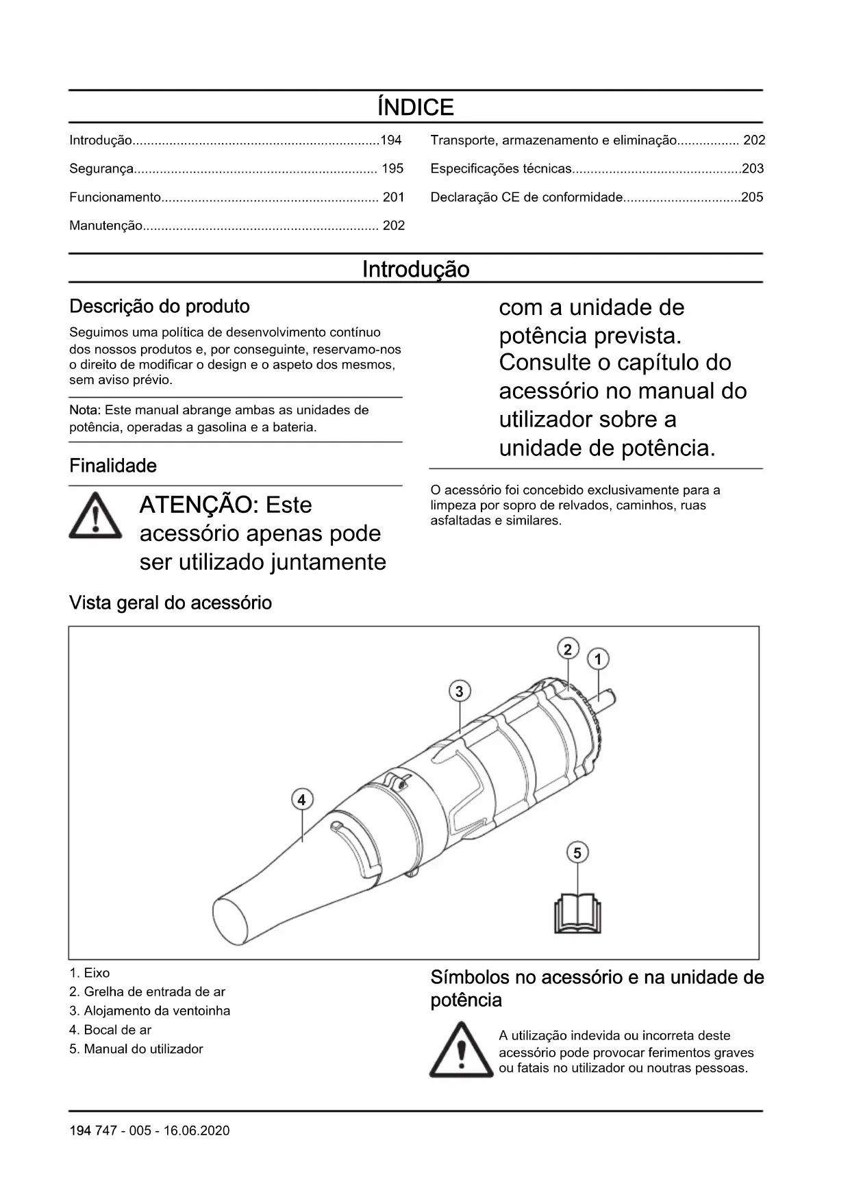 - Declaração CE de conformidade Introdução Descrição do produto Seguimos uma política de desenvolvimento contínuo dos nossos produtos e, por conseguinte, reservamo-nos o direito de modificar o design e o aspeto dos mesmos, sem aviso prévio. Nota: Este manual abrange ambas as unidades de potência, operadas a gasolina e a bateria. Finalidade ATENÇÃO: Este acessório apenas pode ser utilizado juntamente com a unidade de potência prevista. Consulte o capítulo do acessório no manual do utilizador sobre a unidade de potência. O acessório foi concebido exclusivamente para a limpeza por sopro de relvados, caminhos, ruas asfaltadas e similares. Vista geral do acessório p. 205