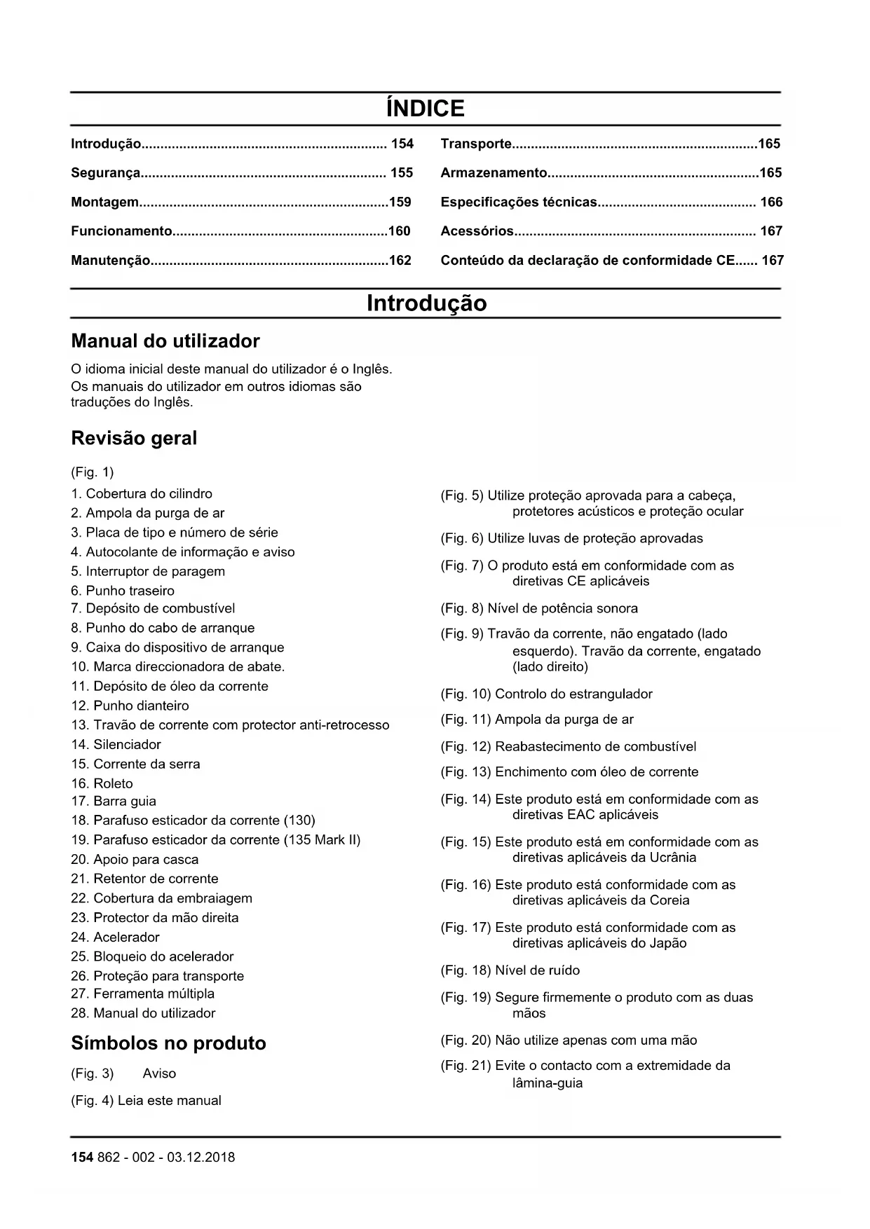 Símbolos no produto (Fig. 3) Aviso (Fig. 4) Leia este manual (Fig. 5) Utilize proteção aprovada para a cabeça, protetores acústicos e proteção ocular (Fig. 6) Utilize luvas de proteção aprovadas (Fig. 7) O produto está em conformidade com as diretivas CE aplicáveis (Fig. 8) Nível de potência sonora (Fig. 9) Travão da corrente, não engatado (lado esquerdo). Travão da corrente, engatado (lado direito) (Fig. 10) Controlo do estrangulador (Fig. 11) Ampola da purga de ar (Fig. 12) Reabastecimento de combustível (Fig. 13) Enchimento com óleo de corrente (Fig. 14) Este produto está em conformidade com as diretivas EAC aplicáveis (Fig. 15) Este produto está em conformidade com as diretivas aplicáveis da Ucrânia (Fig. 16) Este produto está conformidade com as diretivas aplicáveis da Coreia (Fig. 17) Este produto está conformidade com as diretivas aplicáveis do Japão (Fig. 18) Nível de ruído (Fig. 19) Segure firmemente o produto com as duas mãos (Fig. 20) Não utilize apenas com uma mão (Fig. 21) Evite o contacto com a extremidade da lâmina-guia 154 862 - 002 - 03.12.2018(Fig. 22) Cuidado com o retrocesso (Fig. 23) Este produto está em conformidade com as diretivas de compatibilidade eletromagnética aplicáveis da Austrália e da Nova Zelândia. Nota: Os restantes símbolos/autocolantes existentes no produto dizem respeito a exigências para homologação em outras áreas comerciais. Proposta 65 (Fig. 1) UE V ATENÇÃO: A adulteração do motor anula a aprovação deste produto pela UE. Responsabilidade pelo produto Como referido nas leis de responsabilidade pelo produto, não somos responsáveis por danos causados pelo nosso produto se: