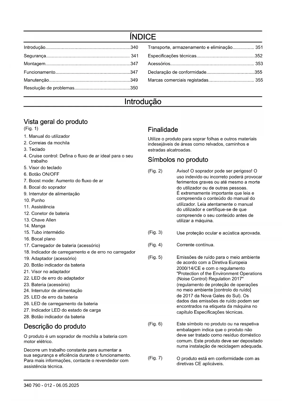 Descrição do produto O produto é um soprador de mochila a bateria com motor elétrico. Decorre um trabalho constante para aumentar a sua segurança e eficiência durante o funcionamento. Para mais informações, contacte o revendedor com assistência técnica. Finalidade Utilize o produto para soprar folhas e outros materiais indesejáveis de áreas como relvados, caminhos e estradas alcatroadas. Símbolos no produto (Fig. 2) Aviso! O soprador pode ser perigoso! O uso indevido ou incorreto poderá provocar ferimentos graves ou até mesmo a morte do utilizador ou de outras pessoas. É extremamente importante que leia e compreenda o conteúdo do manual do utilizador. Leia atentamente o manual do utilizador e certifique-se de que compreende o seu conteúdo antes de utilizar a máquina. (Fig. 3) Use proteção ocular e acústica aprovada. (Fig. 4) Corrente contínua. (Fig. 5) Emissões de ruído para o meio ambiente de acordo com a Diretiva Europeia 2000/14/CE e com o regulamento "Protection of the Environment Operations (Noise Control) Regulation 2017" (regulamento de proteção de operações no meio ambiente [controlo do ruído] de 2017 da Nova Gales do Sul). Os dados das emissões de ruído podem ser encontrados na etiqueta da máquina no capítulo Especificações técnicas. (Fig. 6) Este símbolo no produto ou na respetiva embalagem indica que o produto não deve ser tratado como resíduo doméstico comum. Este produto deve ser depositado numa instalação de reciclagem adequada. (Fig. 7) O produto está em conformidade com as diretivas CE aplicáveis. 340 790 - 012 - 06.05.2025(Fig. 8) Protegido contra salpicos de água. (Fig. 9) LED de aviso (Fig. 10) Botão ON/OFF (Fig. 11) Botão Boost mode (Fig. 12) Botão Cruise control (Fig. 13) Se o produto estiver equipado com tecnologia sem fios Bluetooth