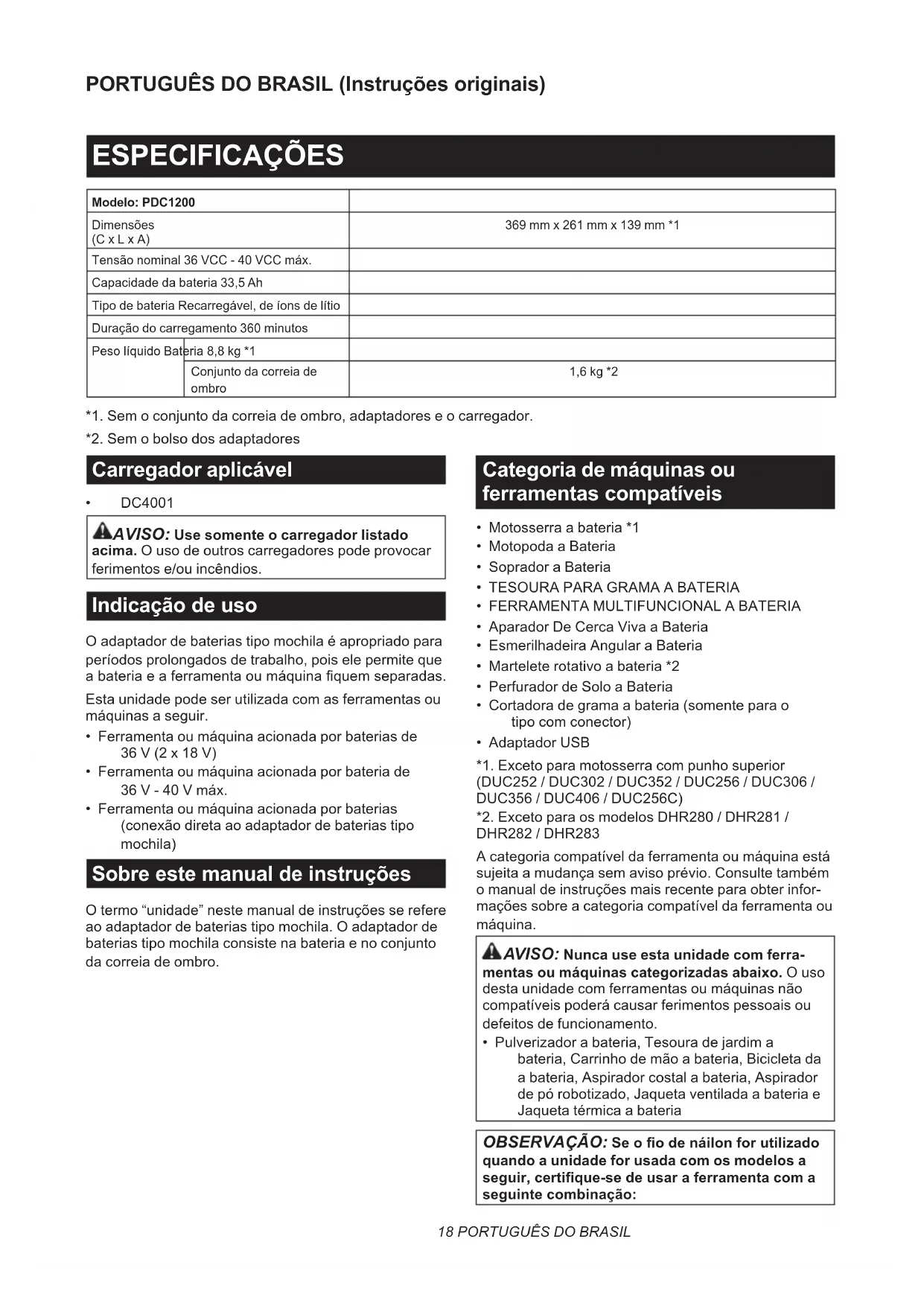 - Shoulder harness NOTE: Some items in the list may be included in the tool package as standard accessories. They may dier from country to country.18 PORTUGUÊS DO BRASIL PORTUGUÊS DO BRASIL (Instruções originais) ESPECIFICAÇÕES Modelo: PDC1200 Dimensões (C x L x A) 369 mm x 261 mm x 139 mm *1 Tensão nominal 36 VCC - 40 VCC máx. Capacidade da bateria 33,5 Ah Tipo de bateria Recarregável, de íons de lítio Duração do carregamento 360 minutos Peso líquido Bateria 8,8 kg *1 Conjunto da correia de ombro 1,6 kg *2 *1. Sem o conjunto da correia de ombro, adaptadores e o carregador. *2. Sem o bolso dos adaptadores Carregador aplicável