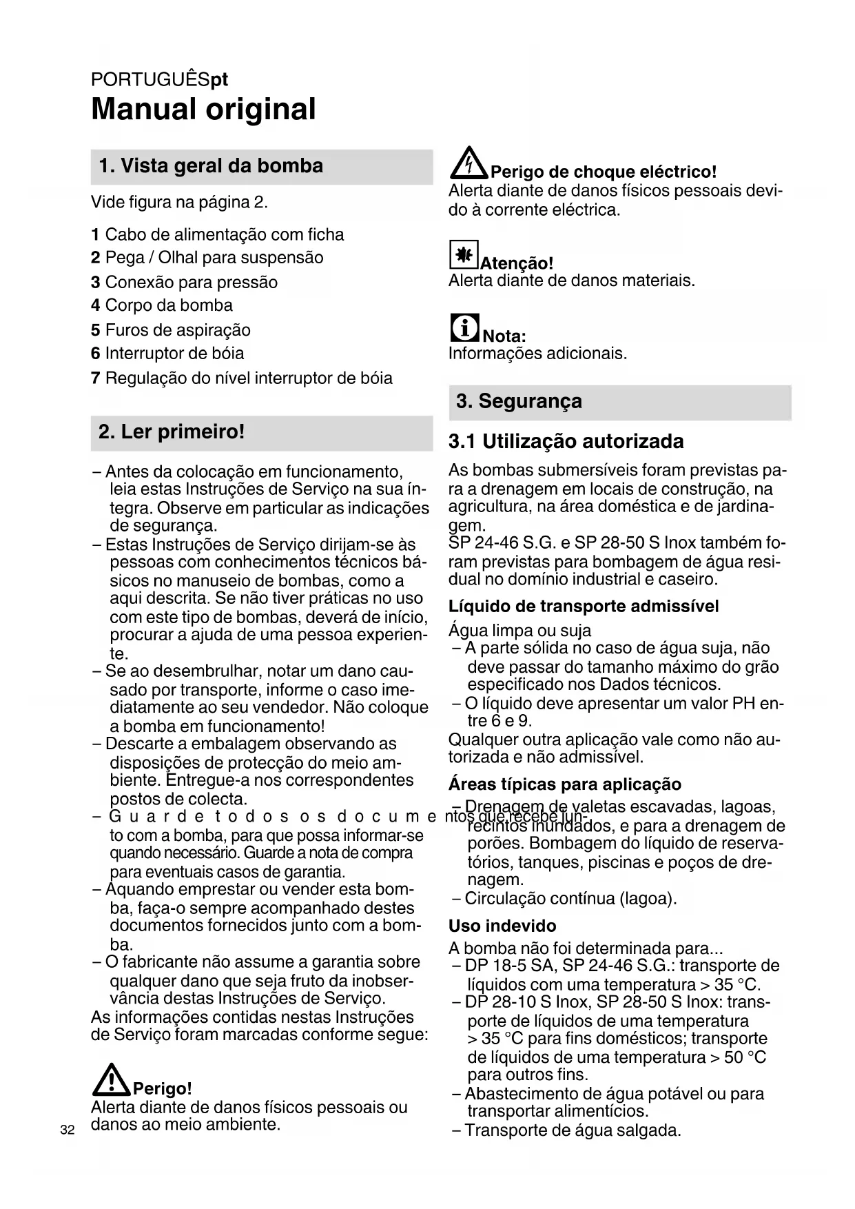 As bombas submersíveis foram previstas pa- ra a drenagem em locais de construção, na agricultura, na área doméstica e de jardina- gem. SP 24-46 S.G. e SP 28-50 S Inox também fo- ram previstas para bombagem de água resi- dual no domínio industrial e caseiro. Líquido de transporte admissível Água limpa ou suja – A parte sólida no caso de água suja, não deve passar do tamanho máximo do grão especificado nos Dados técnicos. – O líquido deve apresentar um valor PH en- tre 6 e 9. Qualquer outra aplicação vale como não au- torizada e não admissível. Áreas típicas para aplicação – Drenagem de valetas escavadas, lagoas, recintos inundados, e para a drenagem de porões. Bombagem do líquido de reserva- tórios, tanques, piscinas e poços de dre- nagem. – Circulação contínua (lagoa). Uso indevido A bomba não foi determinada para... – DP 18-5 SA, SP 24-46 S.G.: transporte de líquidos com uma temperatura > 35 °C. – DP 28-10 S Inox, SP 28-50 S Inox: trans- porte de líquidos de uma temperatura > 35 °C para fins domésticos; transporte de líquidos de uma temperatura > 50 °C para outros fins. – Abastecimento de água potável ou para transportar alimentícios. – Transporte de água salgada.
