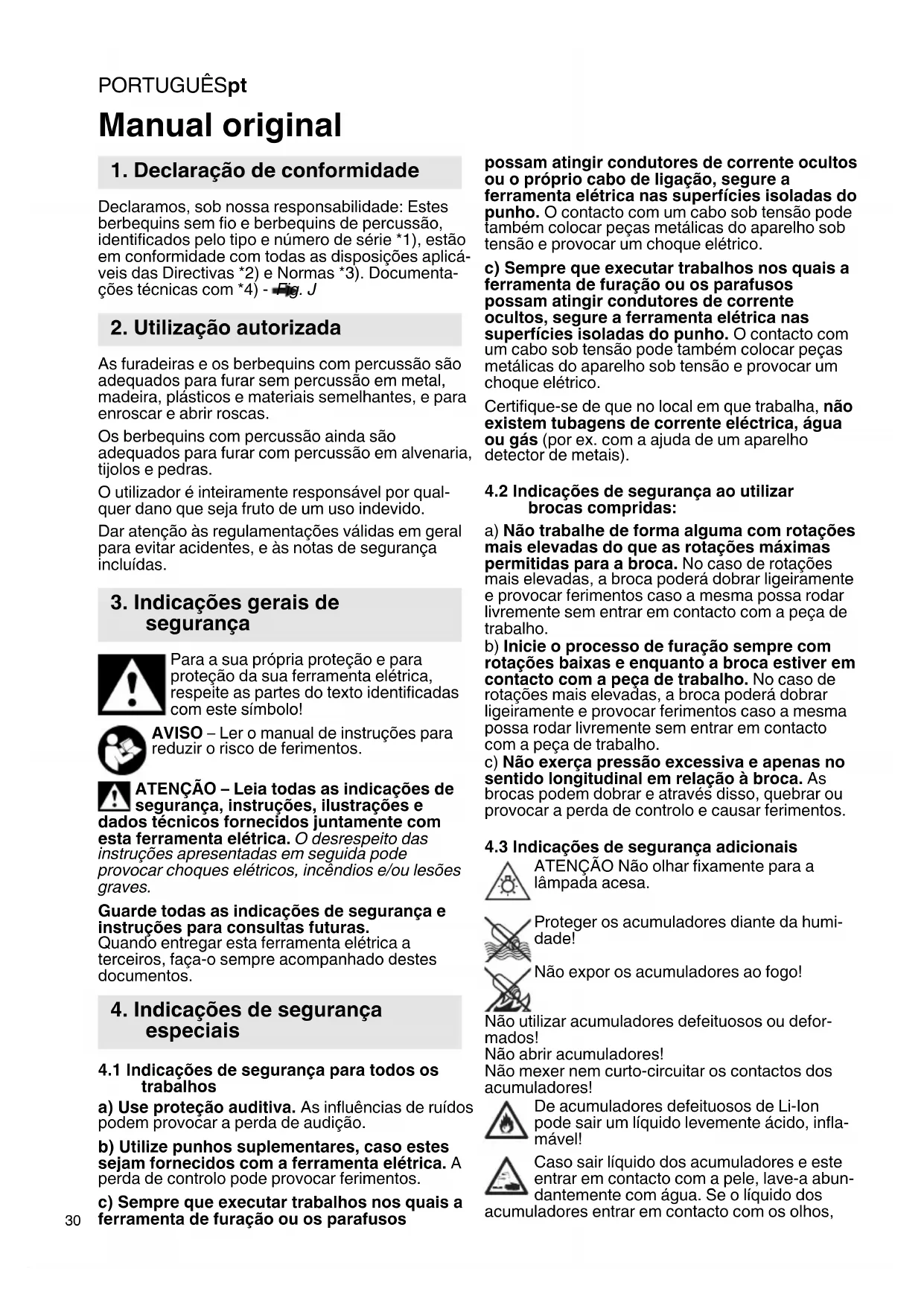 Declaramos, sob nossa responsabilidade: Estes berbequins sem fio e berbequins de percussão, identificados pelo tipo e número de série *1), estão em conformidade com todas as disposições aplicá- veis das Directivas *2) e Normas *3). Documenta- ções técnicas com *4) - Fig. J As furadeiras e os berbequins com percussão são adequados para furar sem percussão em metal, madeira, plásticos e materiais semelhantes, e para enroscar e abrir roscas. Os berbequins com percussão ainda são adequados para furar com percussão em alvenaria, tijolos e pedras. O utilizador é inteiramente responsável por qual- quer dano que seja fruto de um uso indevido. Dar atenção às regulamentações válidas em geral para evitar acidentes, e às notas de segurança incluídas. Para a sua própria proteção e para proteção da sua ferramenta elétrica, respeite as partes do texto identificadas com este símbolo! AVISO – Ler o manual de instruções para reduzir o risco de ferimentos. ATENÇÃO – Leia todas as indicações de segurança, instruções, ilustrações e dados técnicos fornecidos juntamente com esta ferramenta elétrica. O desrespeito das instruções apresentadas em seguida pode provocar choques elétricos, incêndios e/ou lesões graves. Guarde todas as indicações de segurança e instruções para consultas futuras. Quando entregar esta ferramenta elétrica a terceiros, faça-o sempre acompanhado destes documentos.