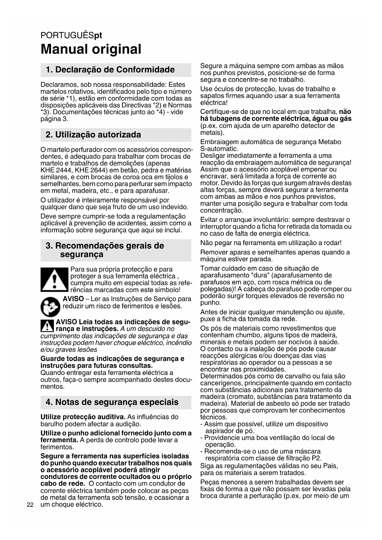 Manual original Declaramos, sob nossa responsabilidade: Estes martelos rotativos, identificados pelo tipo e número de série *1), estão em conformidade com todas as disposições aplicáveis das Directivas *2) e Normas *3). Documentações técnicas junto ao *4) - vide página 3. O martelo perfurador com os acessórios correspon- dentes, é adequado para trabalhar com brocas de martelo e trabalhos de demolições (apenas KHE 2444, KHE 2644) em betão, pedra e matérias similares, e com brocas de coroa oca em tijolos e semelhantes, bem como para perfurar sem impacto em metal, madeira, etc., e para aparafusar. O utilizador é inteiramente responsável por qualquer dano que seja fruto de um uso indevido. Deve sempre cumprir-se toda a regulamentação aplicável à prevenção de acidentes, assim como a informação sobre segurança que aqui se incluí. Para sua própria protecção e para proteger a sua ferramenta eléctrica , cumpra muito em especial todas as refe- rências marcadas com este símbolo! AVISO – Ler as Instruções de Serviço para reduzir um risco de ferimentos e lesões. AVISO Leia todas as indicações de segu- rança e instruções. A um descuido no cumprimento das indicações de segurança e das instruções podem haver choque eléctrico, incêndio e/ou graves lesões Guarde todas as indicações de segurança e instruções para futuras consultas. Quando entregar esta ferramenta eléctrica a outros, faça-o sempre acompanhado destes docu- mentos. Utilize protecção auditiva. As influências do barulho podem afectar a audição. Utilize o punho adicional fornecido junto com a ferramenta. A perda de controlo pode levar a ferimentos. Segure a ferramenta nas superfícies isoladas do punho quando executar trabalhos nos quais o acessório acoplável poderá atingir condutores de corrente ocultados ou o próprio cabo de rede. O contacto com um condutor de corrente eléctrica também pode colocar as peças de metal da ferramenta sob tensão, e ocasionar a um choque eléctrico. Segure a máquina sempre com ambas as mãos nos punhos previstos, posicione-se de forma segura e concentre-se no trabalho. Use óculos de protecção, luvas de trabalho e sapatos firmes aquando usar a sua ferramenta eléctrica! Certifique-se de que no local em que trabalha, não há tubagens de corrente eléctrica, água ou gás (p.ex. com ajuda de um aparelho detector de metais). Embraiagem automática de segurança Metabo S-automatic. Desligar imediatamente a ferramenta a uma reacção da embraiagem automática de segurança! Assim que o acessório acoplável empenar ou encravar, será limitada a força de corrente ao motor. Devido às forças que surgem através destas altas forças, sempre deverá segurar a ferramenta com ambas as mãos e nos punhos previstos, manter uma posição segura e trabalhar com toda concentração. Evitar o arranque involuntário: sempre destravar o interruptor quando a ficha for retirada da tomada ou no caso de falta de energia eléctrica. Não pegar na ferramenta em utilização a rodar! Remover aparas e semelhantes apenas quando a máquina estiver parada. Tomar cuidado em caso de situação de aparafusamento "dura" (aparafusamento de parafusos em aço, com rosca métrica ou de polegadas)! A cabeça do parafuso pode romper ou poderão surgir torques elevados de reversão no punho. Antes de iniciar qualquer manutenção ou ajuste, puxe a ficha da tomada da rede. Os pós de materiais como revestimentos que contenham chumbo, alguns tipos de madeira, minerais e metais podem ser nocivos à saúde. O contacto ou a inalação de pós pode causar reacções alérgicas e/ou doenças das vias respiratórias ao operador ou a pessoas a se encontrar nas proximidades. Determinados pós como de carvalho ou faia são cancerígenos, principalmente quando em contacto com substâncias adicionais para tratamento da madeira (cromato, substâncias para tratamento da madeira). Material de asbesto só pode ser tratado por pessoas que comprovam ter conhecimentos técnicos. - Assim que possível, utilize um dispositivo aspirador de pó. - Providencie uma boa ventilação do local de operação. - Recomenda-se o uso de uma máscara respiratória com classe de filtração P2. Siga as regulamentações válidas no seu País, para os materiais a serem tratados. Peças menores a serem trabalhadas devem ser fixas de forma a que não possam ser levadas pela broca durante a perfuração (p.ex. por meio de um