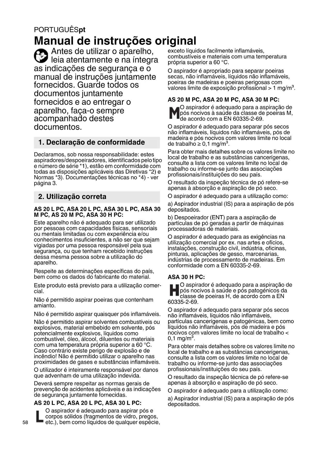 Manual de instruções original Antes de utilizar o aparelho, leia atentamente e na íntegra as indicações de segurança e o manual de instruções juntamente fornecidos. Guarde todos os documentos juntamente fornecidos e ao entregar o aparelho, faça-o sempre acompanhado destes documentos. Declaramos, sob nossa responsabilidade: estes aspiradores/despoeiradores, identificados pelo tipo e número de série *1), estão em conformidade com todas as disposições aplicáveis das Diretivas *2) e Normas *3). Documentações técnicas no *4) - ver página 3. AS 20 L PC, ASA 20 L PC, ASA 30 L PC, ASA 30 M PC, AS 20 M PC, ASA 30 H PC: Este aparelho não é adequado para ser utilizado por pessoas com capacidades físicas, sensoriais ou mentais limitadas ou com experiência e/ou conhecimentos insuficientes, a não ser que sejam vigiadas por uma pessoa responsável pela sua segurança, ou que tenham recebido instruções dessa mesma pessoa sobre a utilização do aparelho. Respeite as determinações específicas do país, bem como os dados do fabricante do material. Este produto está previsto para a utilização comer- cial. Não é permitido aspirar poeiras que contenham amianto. Não é permitido aspirar quaisquer pós inflamáveis. Não é permitido aspirar solventes combustíveis ou explosivos, material embebido em solvente, pós potencialmente explosivos, líquidos como combustível, óleo, álcool, diluentes ou materiais com uma temperatura própria superior a 60 °C. Caso contrário existe perigo de explosão e de incêndio! Não é permitido utilizar o aparelho nas proximidades de gases e substâncias inflamáveis. O utilizador é inteiramente responsável por danos que advenham de uma utilização indevida. Deverá sempre respeitar as normas gerais de prevenção de acidentes aplicáveis e as indicações de segurança juntamente fornecidas. AS 20 L PC, ASA 20 L PC, ASA 30 L PC: O aspirador é adequado para aspirar pós e corpos sólidos (fragmentos de vidro, pregos, etc.), bem como líquidos de qualquer espécie, exceto líquidos facilmente inflamáveis, combustíveis e materiais com uma temperatura própria superior a 60 °C. O aspirador é apropriado para separar poeiras secas, não inflamáveis, líquidos não inflamáveis, poeiras de madeiras e poeiras perigosas com valores limite de exposição profissional > 1 mg/m³. AS 20 M PC, ASA 20 M PC, ASA 30 M PC: O aspirador é adequado para a aspiração de pós nocivos à saúde da classe de poeiras M, de acordo com a EN 60335-2-69. O aspirador é adequado para separar pós secos não inflamáveis, líquidos não inflamáveis, pós de madeira e pós nocivos com valores limite no local de trabalho ≥ 0,1 mg/m³. Para obter mais detalhes sobre os valores limite no local de trabalho e as substâncias cancerígenas, consulte a lista com os valores limite no local de trabalho ou informe-se junto das associações profissionais/instituições do seu país. O resultado da inspeção técnica de pó refere-se apenas à absorção e aspiração de pó seco. O aspirador é adequado para a utilização como: a) Aspirador industrial (IS) para a aspiração de pós depositados. b) Despoeirador (ENT) para a aspiração de partículas de pó geradas a partir de máquinas processadoras de materiais. O aspirador é adequado para as exigências na utilização comercial por ex. nas artes e ofícios, instalações, construção civil, indústria, oficinas, pinturas, aplicações de gesso, marcenarias, indústrias de processamento de madeiras. Em conformidade com a EN 60335-2-69. ASA 30 H PC: O aspirador é adequado para a aspiração de pós nocivos à saúde e pós patogénicos da classe de poeiras H, de acordo com a EN 60335-2-69. O aspirador é adequado para separar pós secos não inflamáveis, líquidos não inflamáveis, partículas cancerígenas e patogénicas, bem como líquidos não inflamáveis, pós de madeira e pós nocivos com valores limite no local de trabalho < 0,1 mg/m³. Para obter mais detalhes sobre os valores limite no local de trabalho e as substâncias cancerígenas, consulte a lista com os valores limite no local de trabalho ou informe-se junto das associações profissionais/instituições do seu país. O resultado da inspeção técnica de pó refere-se apenas à absorção e aspiração de pó seco. O aspirador é adequado para a utilização como: a) Aspirador industrial (IS) para a aspiração de pós depositados.