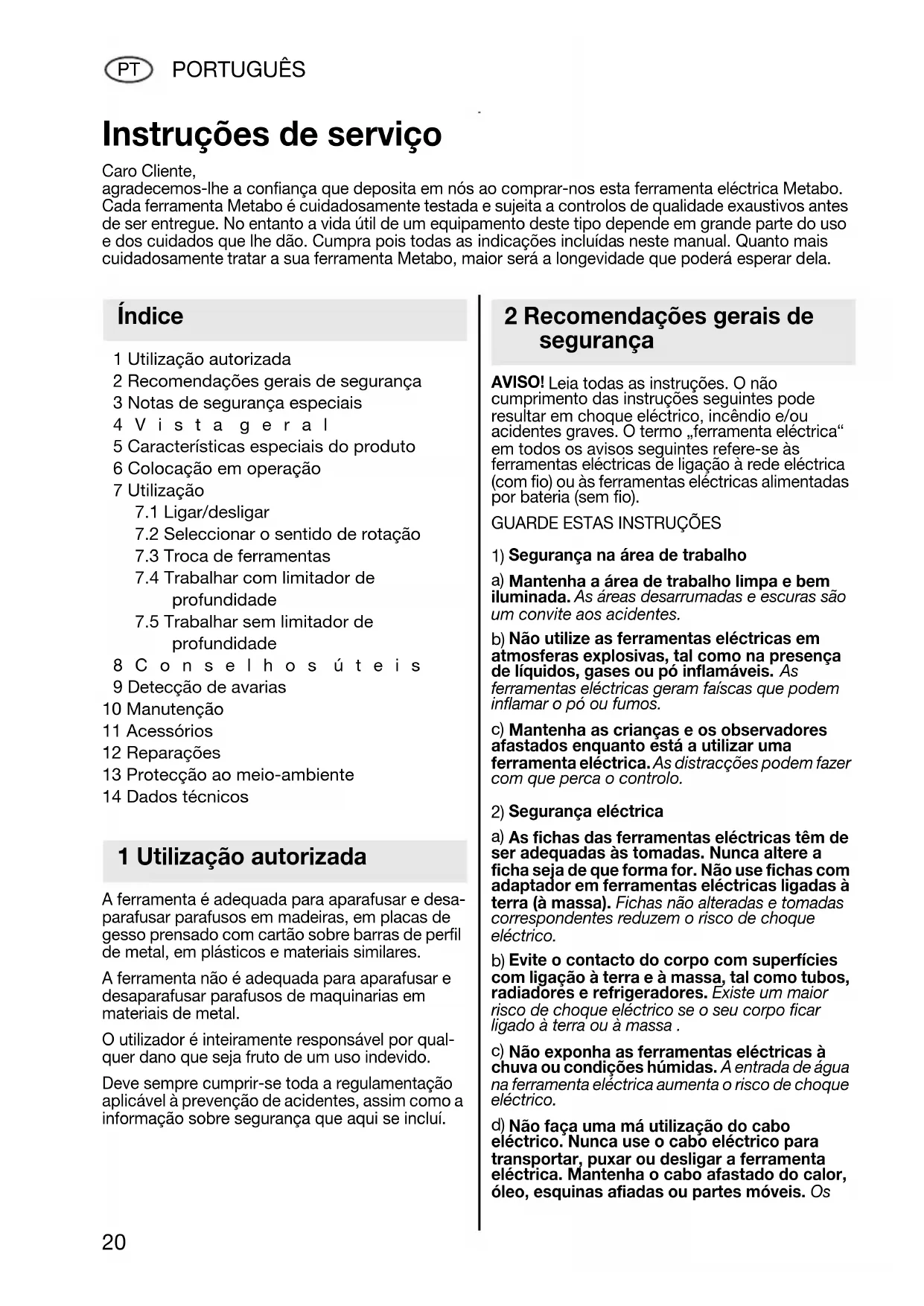 Instruções de serviço Caro Cliente, agradecemos-lhe a confiança que deposita em nós ao comprar-nos esta ferramenta eléctrica Metabo. Cada ferramenta Metabo é cuidadosamente testada e sujeita a controlos de qualidade exaustivos antes de ser entregue. No entanto a vida útil de um equipamento deste tipo depende em grande parte do uso e dos cuidados que lhe dão. Cumpra pois todas as indicações incluídas neste manual. Quanto mais cuidadosamente tratar a sua ferramenta Metabo, maior será a longevidade que poderá esperar dela. Índice 1 Utilização autorizada 2 Recomendações gerais de segurança 17026689_1107 NAFTA SE 4000_SE 28.book Seite 20 Dienstag, 13. November 2007 10:24 10PORTUGUÊS
