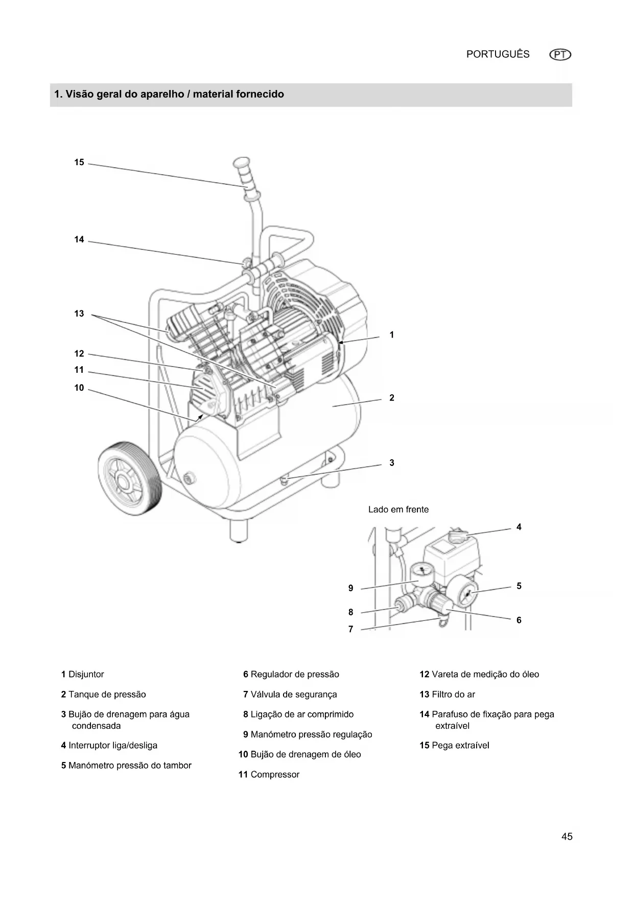 Lado em frente 1 Disjuntor 2 Tanque de pressão 3 Bujão de drenagem para água condensada 4 Interruptor liga/desliga 5 Manómetro pressão do tambor 6 Regulador de pressão 7 Válvula de segurança 8 Ligação de ar comprimido 9 Manómetro pressão regulação 10 Bujão de drenagem de óleo 11 Compressor 12 Vareta de medição do óleo 13 Filtro do ar 14 Parafuso de fixação para pega extraível 15 Pega extraível I_0021pt1A.fm 10.3.10 Manual de serviço originalPORTUGUÊS