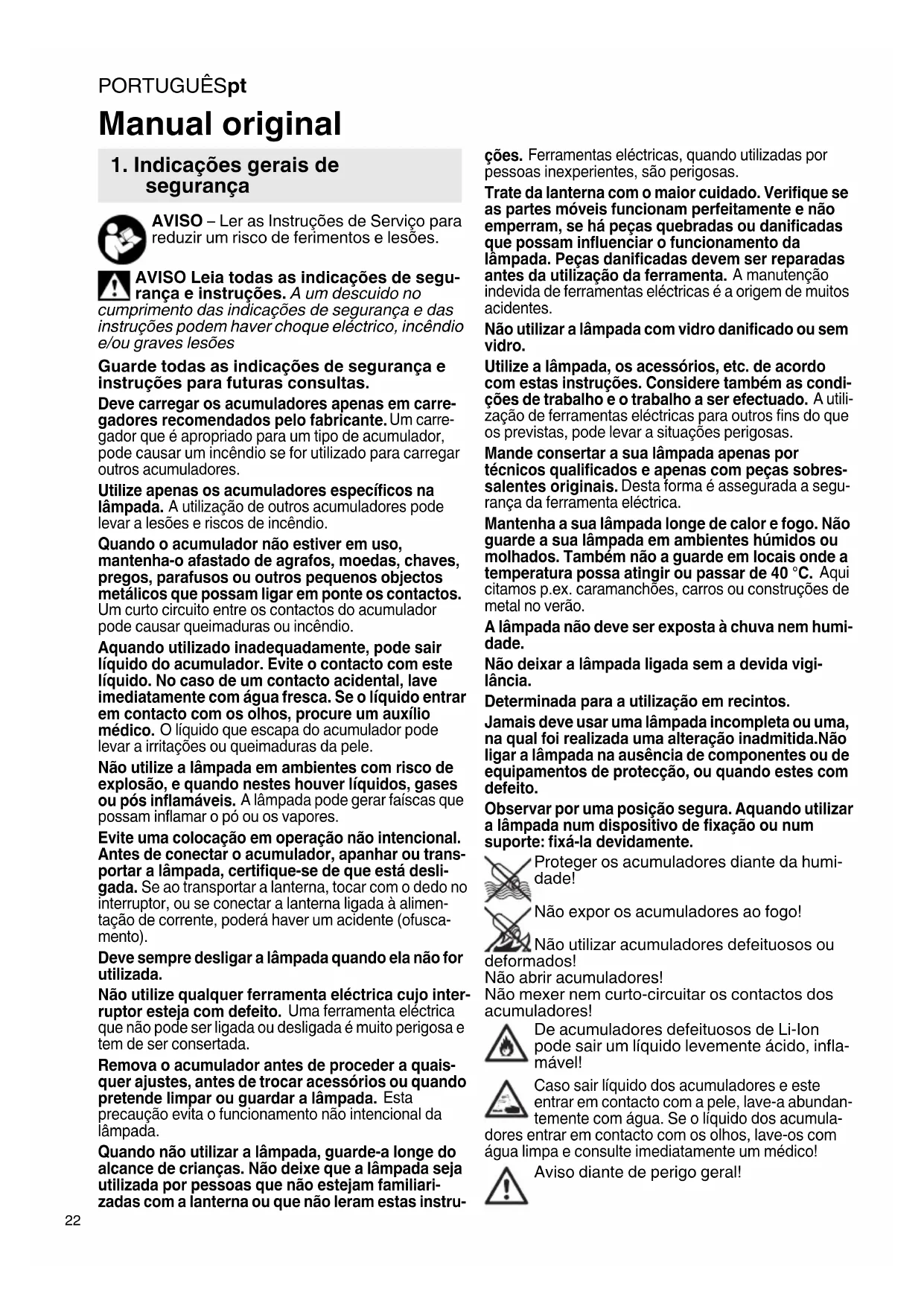 AVISO – Ler as Instruções de Serviço para reduzir um risco de ferimentos e lesões. AVISO Leia todas as indicações de segu- rança e instruções. A um descuido no cumprimento das indicações de segurança e das instruções podem haver choque eléctrico, incêndio e/ou graves lesões Guarde todas as indicações de segurança e instruções para futuras consultas. Deve carregar os acumuladores apenas em carre- gadores recomendados pelo fabricante. Um carre- gador que é apropriado para um tipo de acumulador, pode causar um incêndio se for utilizado para carregar outros acumuladores. Utilize apenas os acumuladores específicos na lâmpada. A utilização de outros acumuladores pode levar a lesões e riscos de incêndio. Quando o acumulador não estiver em uso, mantenha-o afastado de agrafos, moedas, chaves, pregos, parafusos ou outros pequenos objectos metálicos que possam ligar em ponte os contactos. Um curto circuito entre os contactos do acumulador pode causar queimaduras ou incêndio. Aquando utilizado inadequadamente, pode sair líquido do acumulador. Evite o contacto com este líquido. No caso de um contacto acidental, lave imediatamente com água fresca. Se o líquido entrar em contacto com os olhos, procure um auxílio médico. O líquido que escapa do acumulador pode levar a irritações ou queimaduras da pele. Não utilize a lâmpada em ambientes com risco de explosão, e quando nestes houver líquidos, gases ou pós inflamáveis. A lâmpada pode gerar faíscas que possam inflamar o pó ou os vapores. Evite uma colocação em operação não intencional. Antes de conectar o acumulador, apanhar ou trans- portar a lâmpada, certifique-se de que está desli- gada. Se ao transportar a lanterna, tocar com o dedo no interruptor, ou se conectar a lanterna ligada à alimen- tação de corrente, poderá haver um acidente (ofusca- mento). Deve sempre desligar a lâmpada quando ela não for utilizada. Não utilize qualquer ferramenta eléctrica cujo inter- ruptor esteja com defeito. Uma ferramenta eléctrica que não pode ser ligada ou desligada é muito perigosa e tem de ser consertada. Remova o acumulador antes de proceder a quais- quer ajustes, antes de trocar acessórios ou quando pretende limpar ou guardar a lâmpada. Esta precaução evita o funcionamento não intencional da lâmpada. Quando não utilizar a lâmpada, guarde-a longe do alcance de crianças. Não deixe que a lâmpada seja utilizada por pessoas que não estejam familiari- zadas com a lanterna ou que não leram estas instru- ções. Ferramentas eléctricas, quando utilizadas por pessoas inexperientes, são perigosas. Trate da lanterna com o maior cuidado. Verifique se as partes móveis funcionam perfeitamente e não emperram, se há peças quebradas ou danificadas que possam influenciar o funcionamento da lâmpada. Peças danificadas devem ser reparadas antes da utilização da ferramenta. A manutenção indevida de ferramentas eléctricas é a origem de muitos acidentes. Não utilizar a lâmpada com vidro danificado ou sem vidro. Utilize a lâmpada, os acessórios, etc. de acordo com estas instruções. Considere também as condi- ções de trabalho e o trabalho a ser efectuado. A utili- zação de ferramentas eléctricas para outros fins do que os previstas, pode levar a situações perigosas. Mande consertar a sua lâmpada apenas por técnicos qualificados e apenas com peças sobres- salentes originais. Desta forma é assegurada a segu- rança da ferramenta eléctrica. Mantenha a sua lâmpada longe de calor e fogo. Não guarde a sua lâmpada em ambientes húmidos ou molhados. Também não a guarde em locais onde a temperatura possa atingir ou passar de 40 °C. Aqui citamos p.ex. caramanchões, carros ou construções de metal no verão. A lâmpada não deve ser exposta à chuva nem humi- dade. Não deixar a lâmpada ligada sem a devida vigi- lância. Determinada para a utilização em recintos. Jamais deve usar uma lâmpada incompleta ou uma, na qual foi realizada uma alteração inadmitida.Não ligar a lâmpada na ausência de componentes ou de equipamentos de protecção, ou quando estes com defeito. Observar por uma posição segura. Aquando utilizar a lâmpada num dispositivo de fixação ou num suporte: fixá-la devidamente. Proteger os acumuladores diante da humi- dade! Não expor os acumuladores ao fogo! Não utilizar acumuladores defeituosos ou deformados! Não abrir acumuladores! Não mexer nem curto-circuitar os contactos dos acumuladores! De acumuladores defeituosos de Li-Ion pode sair um líquido levemente ácido, infla- mável! Caso sair líquido dos acumuladores e este entrar em contacto com a pele, lave-a abundan- temente com água. Se o líquido dos acumula- dores entrar em contacto com os olhos, lave-os com água limpa e consulte imediatamente um médico! Aviso diante de perigo geral! Manual original