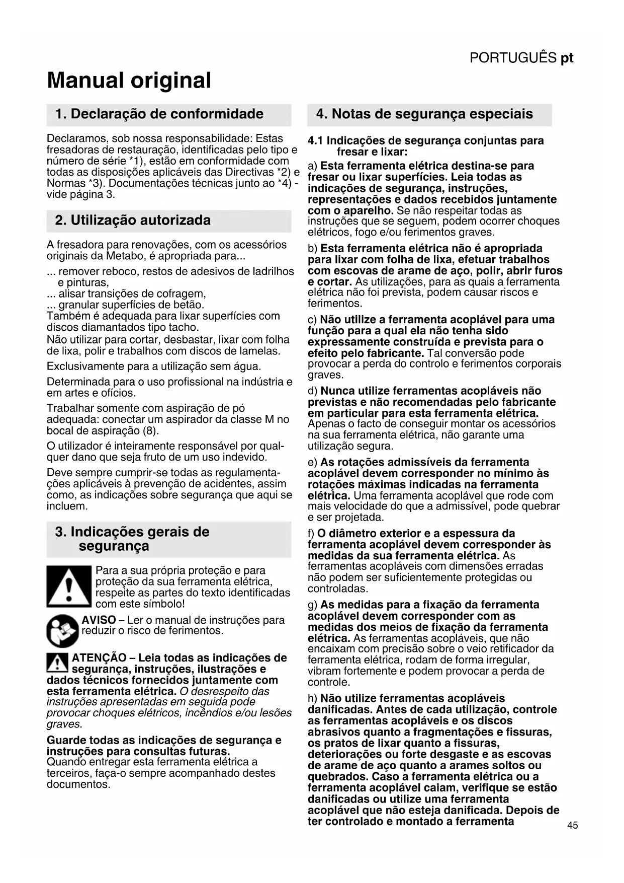 Manual original Declaramos, sob nossa responsabilidade: Estas fresadoras de restauração, identificadas pelo tipo e número de série *1), estão em conformidade com todas as disposições aplicáveis das Directivas *2) e Normas *3). Documentações técnicas junto ao *4) - vide página 3. A fresadora para renovações, com os acessórios originais da Metabo, é apropriada para... ... remover reboco, restos de adesivos de ladrilhos e pinturas, ... alisar transições de cofragem, ... granular superfícies de betão. Também é adequada para lixar superfícies com discos diamantados tipo tacho. Não utilizar para cortar, desbastar, lixar com folha de lixa, polir e trabalhos com discos de lamelas. Exclusivamente para a utilização sem água. Determinada para o uso profissional na indústria e em artes e ofícios. Trabalhar somente com aspiração de pó adequada: conectar um aspirador da classe M no bocal de aspiração (8). O utilizador é inteiramente responsável por qual- quer dano que seja fruto de um uso indevido. Deve sempre cumprir-se todas as regulamenta- ções aplicáveis à prevenção de acidentes, assim como, as indicações sobre segurança que aqui se incluem. Para a sua própria proteção e para proteção da sua ferramenta elétrica, respeite as partes do texto identificadas com este símbolo! AVISO – Ler o manual de instruções para reduzir o risco de ferimentos. ATENÇÃO – Leia todas as indicações de segurança, instruções, ilustrações e dados técnicos fornecidos juntamente com esta ferramenta elétrica. O desrespeito das instruções apresentadas em seguida pode provocar choques elétricos, incêndios e/ou lesões graves. Guarde todas as indicações de segurança e instruções para consultas futuras. Quando entregar esta ferramenta elétrica a terceiros, faça-o sempre acompanhado destes documentos.