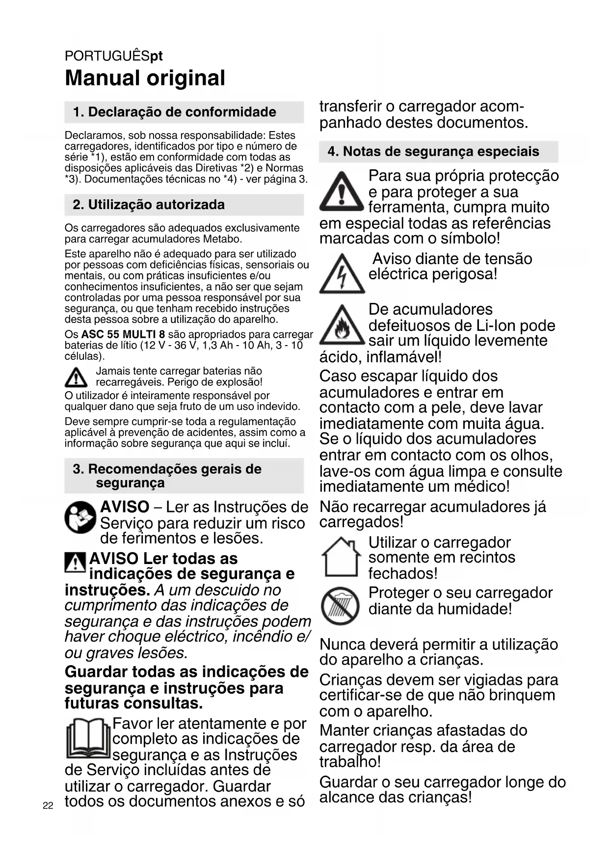 Manual original Declaramos, sob nossa responsabilidade: Estes carregadores, identificados por tipo e número de série *1), estão em conformidade com todas as disposições aplicáveis das Diretivas *2) e Normas *3). Documentações técnicas no *4) - ver página 3. Os carregadores são adequados exclusivamente para carregar acumuladores Metabo. Este aparelho não é adequado para ser utilizado por pessoas com deficiências físicas, sensoriais ou mentais, ou com práticas insuficientes e/ou conhecimentos insuficientes, a não ser que sejam controladas por uma pessoa responsável por sua segurança, ou que tenham recebido instruções desta pessoa sobre a utilização do aparelho. Os ASC 55 MULTI 8 são apropriados para carregar baterias de lítio (12 V - 36 V, 1,3 Ah - 10 Ah, 3 - 10 células). Jamais tente carregar baterias não recarregáveis. Perigo de explosão! O utilizador é inteiramente responsável por qualquer dano que seja fruto de um uso indevido. Deve sempre cumprir-se toda a regulamentação aplicável à prevenção de acidentes, assim como a informação sobre segurança que aqui se incluí. AVISO – Ler as Instruções de Serviço para reduzir um risco de ferimentos e lesões. AVISO Ler todas as indicações de segurança e instruções. A um descuido no cumprimento das indicações de segurança e das instruções podem haver choque eléctrico, incêndio e/ ou graves lesões. Guardar todas as indicações de segurança e instruções para futuras consultas. Favor ler atentamente e por completo as indicações de segurança e as Instruções de Serviço incluídas antes de utilizar o carregador. Guardar todos os documentos anexos e só transferir o carregador acom- panhado destes documentos. Para sua própria protecção e para proteger a sua ferramenta, cumpra muito em especial todas as referências marcadas com o símbolo! Aviso diante de tensão eléctrica perigosa! De acumuladores defeituosos de Li-Ion pode sair um líquido levemente ácido, inflamável! Caso escapar líquido dos acumuladores e entrar em contacto com a pele, deve lavar imediatamente com muita água. Se o líquido dos acumuladores entrar em contacto com os olhos, lave-os com água limpa e consulte imediatamente um médico! Não recarregar acumuladores já carregados! Utilizar o carregador somente em recintos fechados! Proteger o seu carregador diante da humidade! Nunca deverá permitir a utilização do aparelho a crianças. Crianças devem ser vigiadas para certificar-se de que não brinquem com o aparelho. Manter crianças afastadas do carregador resp. da área de trabalho! Guardar o seu carregador longe do alcance das crianças!