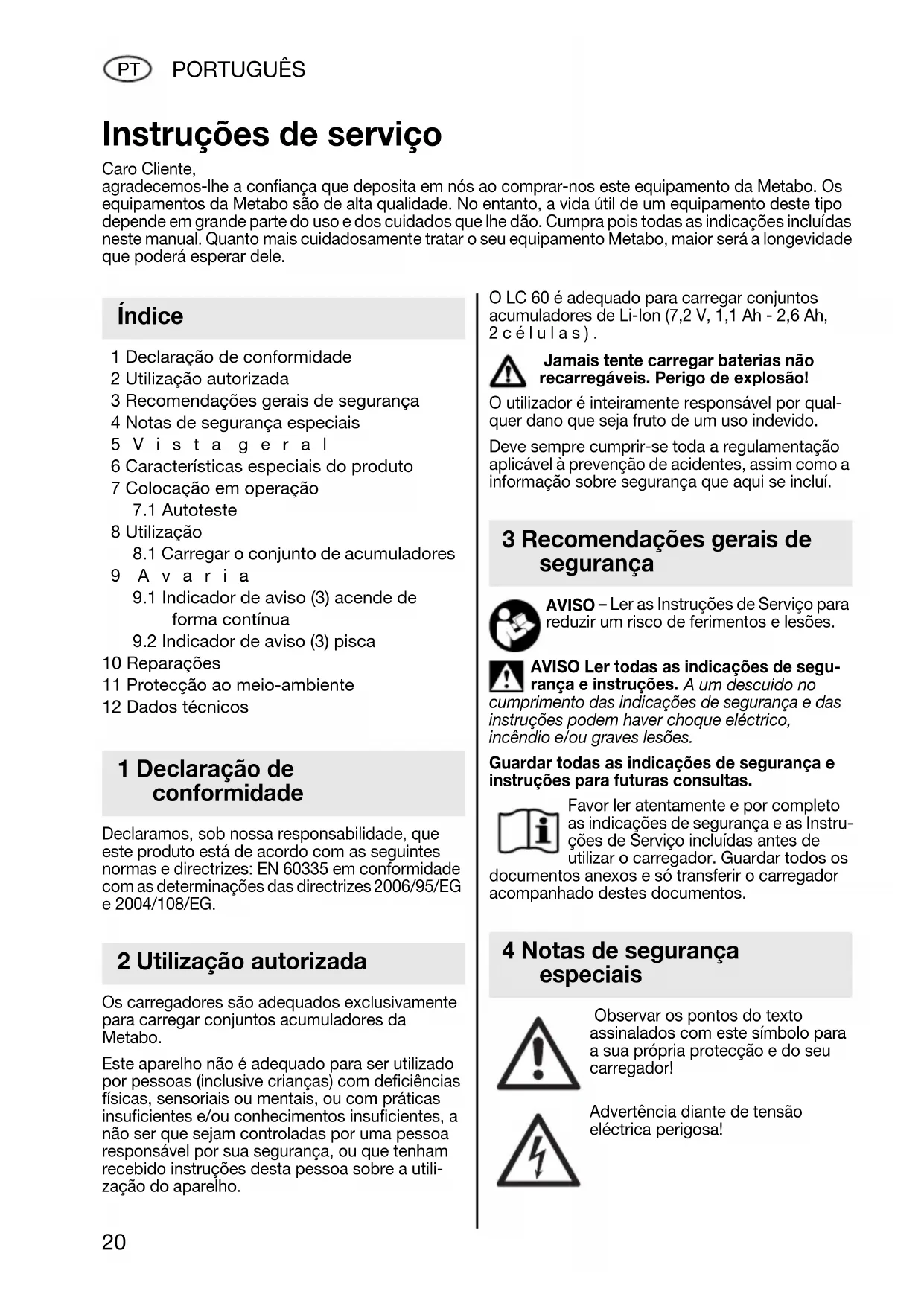 10 Reparações 11 Protecção ao meio-ambiente 12 Dados técnicos Declaramos, sob nossa responsabilidade, que este produto está de acordo com as seguintes normas e directrizes: EN 60335 em conformidade com as determinações das directrizes 2006/95/EG e 2004/108/EG. Os carregadores são adequados exclusivamente para carregar conjuntos acumuladores da Metabo. Este aparelho não é adequado para ser utilizado por pessoas (inclusive crianças) com deficiências físicas, sensoriais ou mentais, ou com práticas insuficientes e/ou conhecimentos insuficientes, a não ser que sejam controladas por uma pessoa responsável por sua segurança, ou que tenham recebido instruções desta pessoa sobre a utili- zação do aparelho. O LC 60 é adequado para carregar conjuntos acumuladores de Li-Ion (7,2 V, 1,1 Ah - 2,6 Ah, 2células). Jamais tente carregar baterias não recarregáveis. Perigo de explosão! O utilizador é inteiramente responsável por qual- quer dano que seja fruto de um uso indevido. Deve sempre cumprir-se toda a regulamentação aplicável à prevenção de acidentes, assim como a informação sobre segurança que aqui se incluí. AVISO – Ler as Instruções de Serviço para reduzir um risco de ferimentos e lesões. AVISO Ler todas as indicações de segu- rança e instruções. A um descuido no cumprimento das indicações de segurança e das instruções podem haver choque eléctrico, incêndio e/ou graves lesões. Guardar todas as indicações de segurança e instruções para futuras consultas. Favor ler atentamente e por completo as indicações de segurança e as Instru- ções de Serviço incluídas antes de utilizar o carregador. Guardar todos os documentos anexos e só transferir o carregador acompanhado destes documentos. Observar os pontos do texto assinalados com este símbolo para a sua própria protecção e do seu carregador! Advertência diante de tensão eléctrica perigosa! Instruções de serviço Caro Cliente, agradecemos-lhe a confiança que deposita em nós ao comprar-nos este equipamento da Metabo. Os equipamentos da Metabo são de alta qualidade. No entanto, a vida útil de um equipamento deste tipo depende em grande parte do uso e dos cuidados que lhe dão. Cumpra pois todas as indicações incluídas neste manual. Quanto mais cuidadosamente tratar o seu equipamento Metabo, maior será a longevidade que poderá esperar dele. Índice 1 Declaração de conformidade 2 Utilização autorizada 3 Recomendações gerais de segurança 4 Notas de segurança especiaisPORTUGUÊS