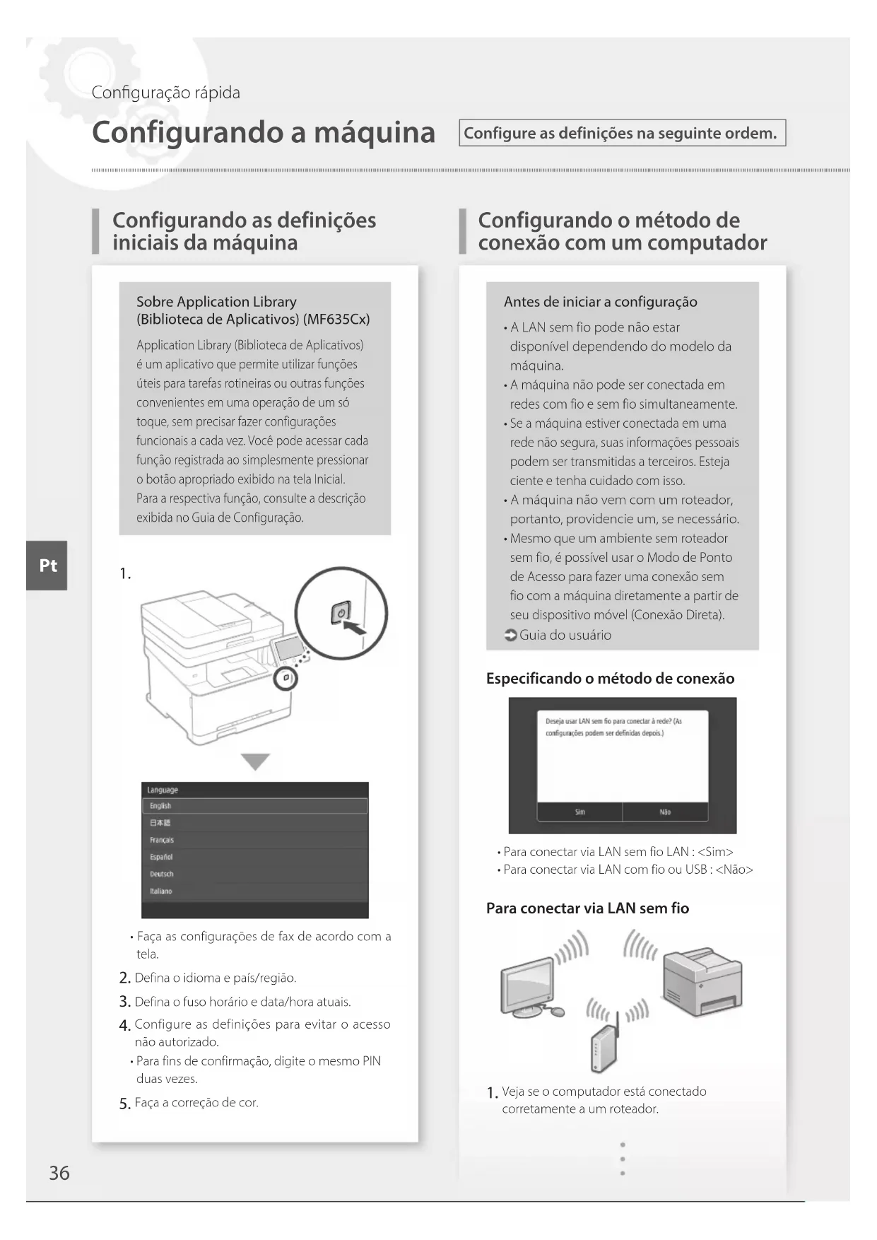 Configurando a máquina Configurando as definições iniciais da máquina Configure as definições na seguinte ordem. Conguração rápida PtPara detalhes "Congurar usando o guia de conguração" no Guia do Usuário Verifique as configurações de rede do computador. Anote o SSID e chave da rede.• Veja o rótulo no roteador. Guia do usuário A operação de configuração é mais fácil se o roteador tiver uma marca WPS. Guia do usuário Defina o ponto de acesso e chave de rede de acordo com a tela.1. Pressione <OK>.2. Pressione <Configurações de SSID>.3. Pressione <Selecionar Ponto de Acesso>.4. Selecione o ponto de acesso (SSID), e pressione <Próxima>.5. Insira uma chave WEP (chave de rede) e pressione <Aplicar>.6. Pressione <Sim>.• O endereço IP será configurado automaticamente em alguns minutos.• "Conectado." é exibido. Instale o driver e software. "Instalando o software" na página 38.Agora que terminou de ajustar as configurações iniciais.Se sua máquina tem a função de fax, continue a fazer as configurações de fax. página 39 Para conectar via LAN com fio A máquina não vem com um cabo de rede.Por favor, providencie um, se necessário. Veja se o computador está conectado corretamente a um roteador. Verifique as configurações de rede do computador. Conecte o cabo de rede.• Após conectar o cabo, aguarde alguns minutos (até que o endereço IP seja definido automaticamente).• Se um endereço IP estático foi definido no computador, defina o endereço IP da máquina manualmente. Instale o driver e software. "Instalando o software" na página 38.Agora que terminou de ajustar as configurações iniciais.Se sua máquina tem a função de fax, continue a fazer as configurações de fax. página 39