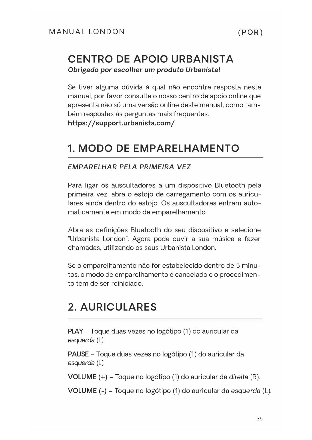 Obrigado por escolher um produto Urbanista! Se tiver alguma dúvida à qual não encontre resposta neste manual, por favor consulte o nosso centro de apoio online que apresenta não só uma versão online deste manual, como tam- bém respostas às perguntas mais frequentes. https://support.urbanista.com/36 ATENDER UMA CHAMADA - Toque duas vezes no logótipo (1) do auricular Esquerdo (L) ou Direito (R). DESLIGAR UMA CHAMADA - Toque duas vezes no logótipo (1) do auricular Esquerdo (L) ou Direito (R). REJEITAR UMA CHAMADA - Mantenha premido o logótipo (1) do auricular Esquerdo (L) ou Direito (R). SIRI - Toque duas vezes no logótipo (1) do auricular Direito (R). LIGAR/DESLIGAR CANCELAMENTO DO RUÍDO ATIVO - Mantenha premido o logótipo (1) do auricular Direito (R) du- rante 2 segundos. LIGAR/DESLIGAR MODO DE SOM AMBIENTE - Mantenha premido o logótipo (1) do auricular Esquerdo (L) durante 2 se- gundos. DETEÇÃO DE OUVIDO – Os sensores integrados param a música automaticamente se um auricular for retirado do seu ouvido. A função de reprodução automática será ativada quando voltar a colocar o auricular na sua orelha, e a música será novamente reproduzida. Depois de retirado da sua ore- lha, a função de botão tátil será desativada. As chamadas não serão desligadas, mesmo se um auricular for retirado de uma orelha. INDICADOR DE ESTADO DA BATERIA – Depois de fechar a tampa do estojo de carregamento, as luzes do indicador de bateria (3) apresentarão o nível restante da bateria. AVISO DE BATERIA FRACA - Quando a sua bateria estiver a ficar com pouca energia, ouvirá um aviso de voz de “bateria fraca” e restarão 30 minutos de utilização até os auscultadores se desligarem automaticamente.