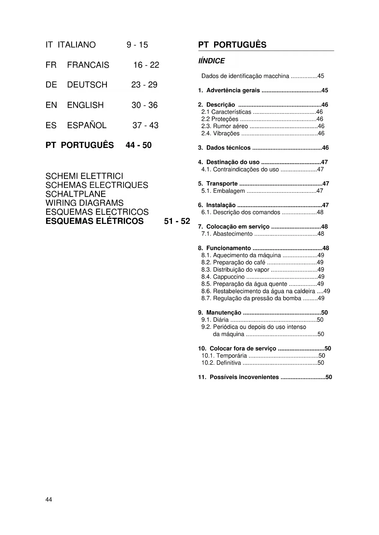 - Desligar o fio de alimentação, Embalar a máquina com papelão ou similar e entregá-la às pessoas prepostas (sucatagem de rejeitos autorizada ou recolha de usados).51 SCHEMI ELETTRICI SCHEMAS ELECTRIQUES SCHALTPLANE WIRING DIAGRAMS ESQUEMAS ELECTRICOS