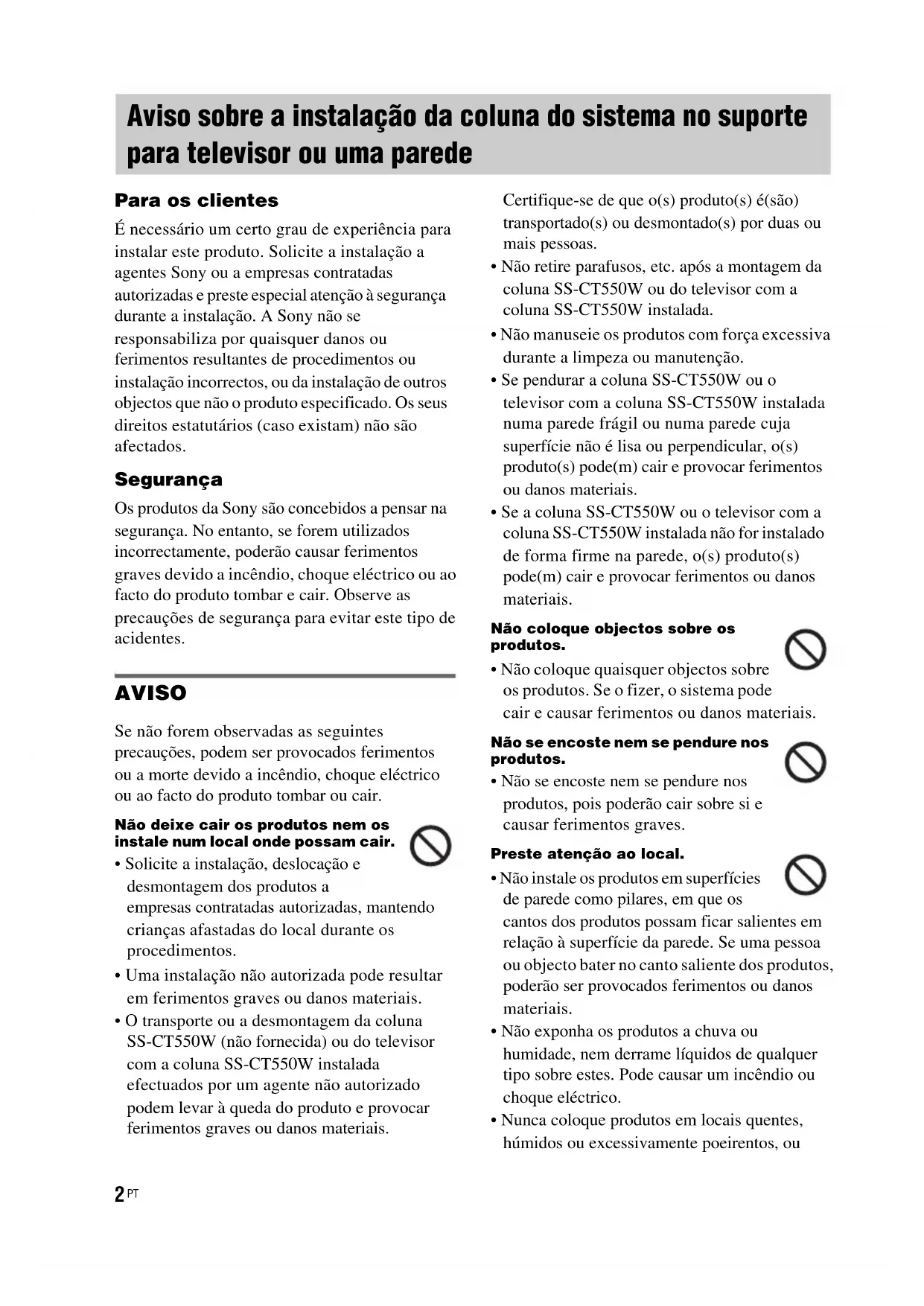 - Fixe firmemente a coluna SS-CT550W e o televisor ao instalá-los em conjunto. Em seguida, fixe com firmeza o televisor com a coluna SS-CT550W instalada no suporte ou na parede. Se a coluna SS-CT550W e o televisor não forem instalados de forma segura, poderão cair ou tombar e provocar ferimentos. Não coloque cargas pesadas em cima dos produtos nem os sujeite a qualquer tipo de impacto.