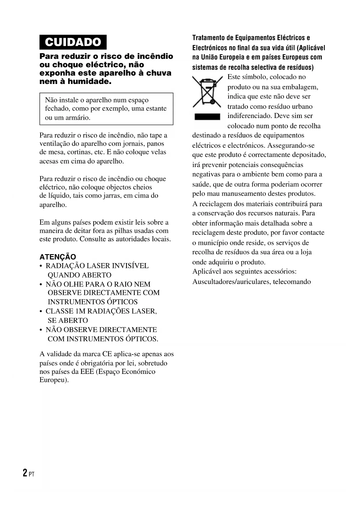 Télécommande 8 TEXT 25 TIMER 25, 28 TRACK 26 TUNE_STEP 31 D-NF430/NF431.FR.2-663-956-21(1) 38 FRD-NF430/NF431.FR.2-663-956-21(1)CUIDADO Para reduzir o risco de incêndio ou choque eléctrico, não exponha este aparelho à chuva nem à humidade. Não instale o aparelho num espaço fechado, como por exemplo, uma estante ou um armário. Para reduzir o risco de incêndio, não tape a ventilação do aparelho com jornais, panos de mesa, cortinas, etc. E não coloque velas acesas em cima do aparelho. Para reduzir o risco de incêndio ou choque eléctrico, não coloque objectos cheios de líquido, tais como jarras, em cima do aparelho. Em alguns países podem existir leis sobre a maneira de deitar fora as pilhas usadas com este produto. Consulte as autoridades locais. ATENÇÃO