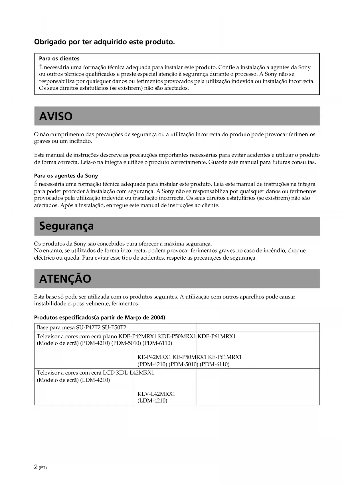 B2 (PT) Obrigado por ter adquirido este produto. Para os clientes É necessária uma formação técnica adequada para instalar este produto. Confie a instalação a agentes da Sony ou outros técnicos qualificados e preste especial atenção à segurança durante o processo. A Sony não se responsabiliza por quaisquer danos ou ferimentos provocados pela utilização indevida ou instalação incorrecta. Os seus direitos estatutários (se existirem) não são afectados. AVISO O não cumprimento das precauções de segurança ou a utilização incorrecta do produto pode provocar ferimentos graves ou um incêndio. Este manual de instruções descreve as precauções importantes necessárias para evitar acidentes e utilizar o produto de forma correcta. Leia-o na íntegra e utilize o produto correctamente. Guarde este manual para futuras consultas. Para os agentes da Sony É necessária uma formação técnica adequada para instalar este produto. Leia este manual de instruções na íntegra para poder proceder à instalação com segurança. A Sony não se responsabiliza por quaisquer danos ou ferimentos provocados pela utilização indevida ou instalação incorrecta. Os seus direitos estatutários (se existirem) não são afectados. Após a instalação, entregue este manual de instruções ao cliente. Segurança Os produtos da Sony são concebidos para oferecer a máxima segurança. No entanto, se utilizados de forma incorrecta, podem provocar ferimentos graves no caso de incêndio, choque eléctrico ou queda. Para evitar esse tipo de acidentes, respeite as precauções de segurança. ATENÇÃO Esta base só pode ser utilizada com os produtos seguintes. A utilização com outros aparelhos pode causar instabilidade e, possivelmente, ferimentos. Produtos especificados(a partir de Março de 2004) Base para mesa SU-P42T2 SU-P50T2 Televisor a cores com ecrã plano KDE-P42MRX1 KDE-P50MRX1 KDE-P61MRX1 (Modelo de ecrã) (PDM-4210) (PDM-5010) (PDM-6110)