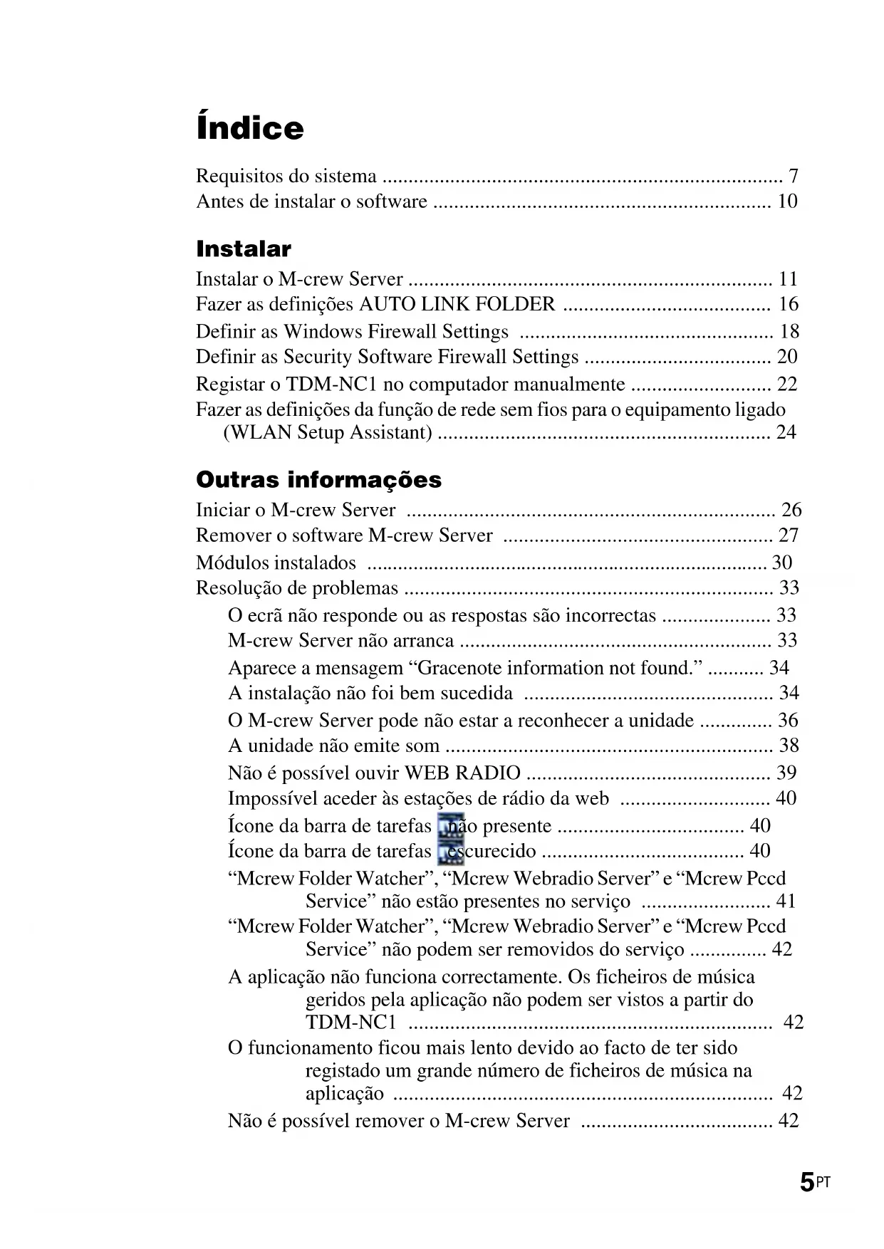“Mcrew Folder Watcher”, “Mcrew Webradio Server” e “Mcrew Pccd Service” não podem ser removidos do serviço A aplicação não funciona correctamente. Os ficheiros de música geridos pela aplicação não podem ser vistos a partir do TDM-NC1 O funcionamento ficou mais lento devido ao facto de ter sido registado um grande número de ficheiros de música na aplicação Não é possível remover o M-crew Server