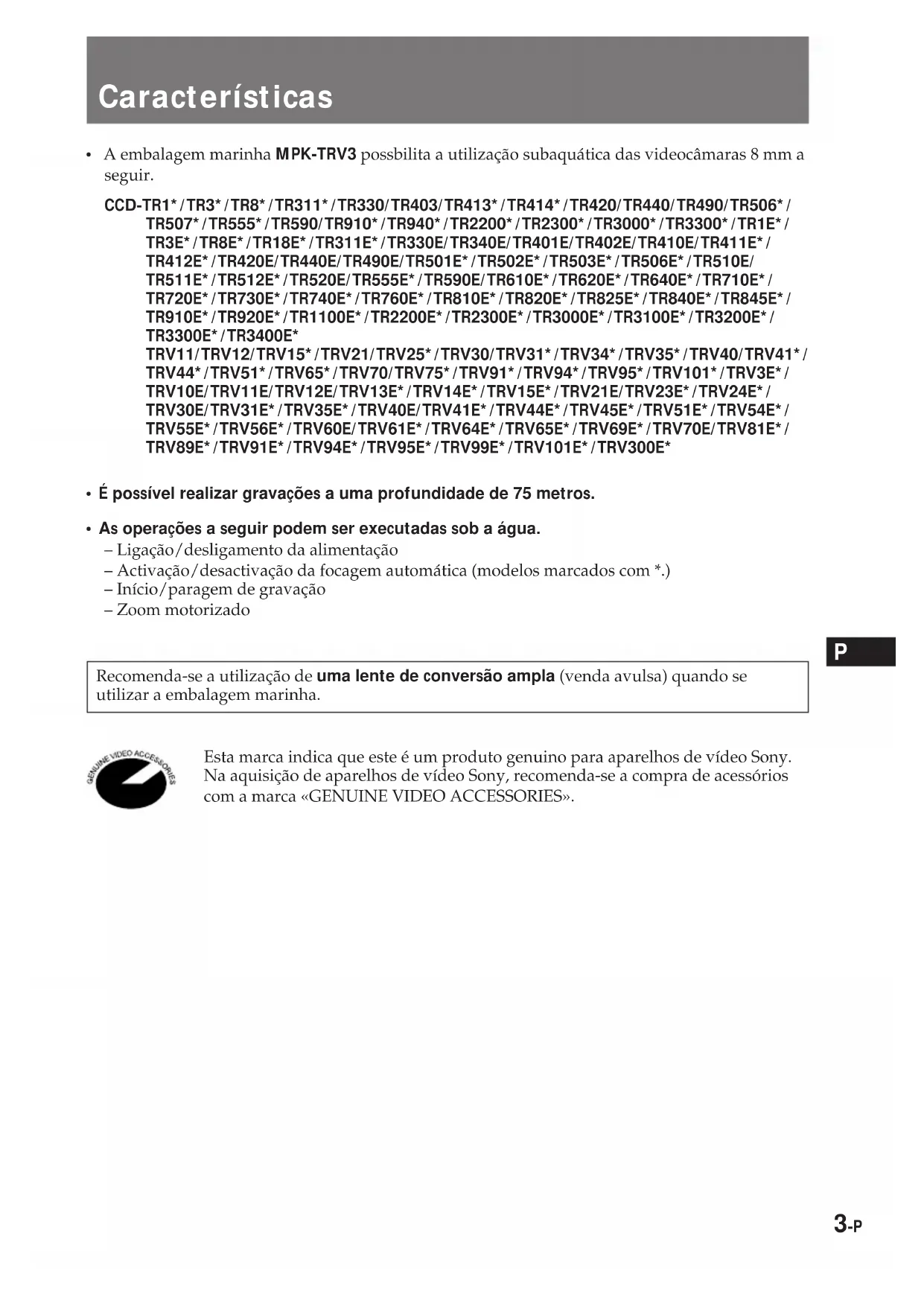 - As operações a seguir podem ser executadas sob a água. – Ligação/desligamento da alimentação – Activação/desactivação da focagem automática (modelos marcados com *.) – Início/paragem de gravação – Zoom motorizado Recomenda-se a utilização de uma lente de conversão ampla (venda avulsa) quando se utilizar a embalagem marinha. Esta marca indica que este é um produto genuino para aparelhos de vídeo Sony. Na aquisição de aparelhos de vídeo Sony, recomenda-se a compra de acessórios com a marca «GENUINE VIDEO ACCESSORIES».4-P Precauções Acerca da videocâmara Tome cuidado para não expor o equipamento ao ar salino. Não respingue água no equipamento.