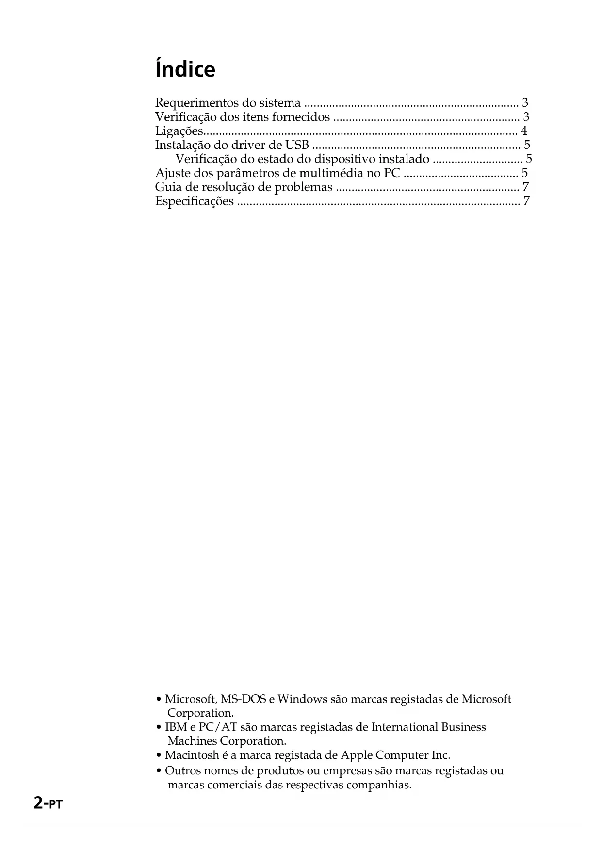 - Outros nomes de produtos ou empresas são marcas registadas ou marcas comerciais das respectivas companhias. Índice Requerimentos do sistema ..................................................................... 3 Verificação dos itens fornecidos ............................................................ 3 Ligações..................................................................................................... 4 Instalação do driver de USB ................................................................... 5 Verificação do estado do dispositivo instalado ............................. 5 Ajuste dos parâmetros de multimédia no PC ..................................... 5 Guia de resolução de problemas ........................................................... 7 Especificações ........................................................................................... 73-PT Requerimentos do sistema Os seguintes hardwares são necessários para a utilização do kit PCLK-U5. s IBM PC/AT ou compatível (Este software não funciona em Apple Macintosh.) s CPU*: Intel Pentium II 233 MHz/ Celeron 300A ou superior