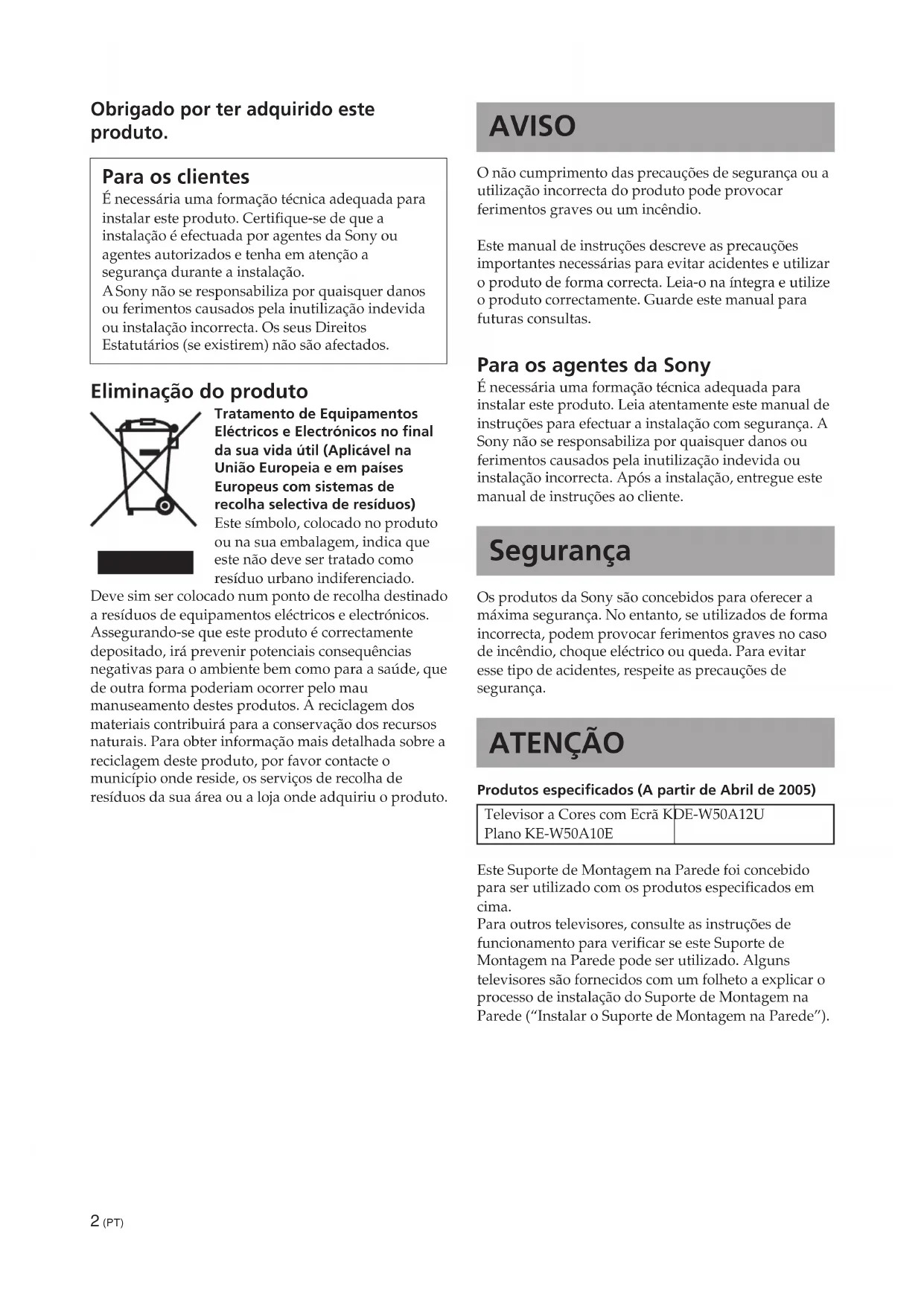 1312 (PT) AVISO O não cumprimento das precauções de segurança ou a utilização incorrecta do produto pode provocar ferimentos graves ou um incêndio. Este manual de instruções descreve as precauções importantes necessárias para evitar acidentes e utilizar o produto de forma correcta. Leia-o na íntegra e utilize o produto correctamente. Guarde este manual para futuras consultas. Para os agentes da Sony É necessária uma formação técnica adequada para instalar este produto. Leia atentamente este manual de instruções para efectuar a instalação com segurança. A Sony não se responsabiliza por quaisquer danos ou ferimentos causados pela inutilização indevida ou instalação incorrecta. Após a instalação, entregue este manual de instruções ao cliente. Segurança Os produtos da Sony são concebidos para oferecer a máxima segurança. No entanto, se utilizados de forma incorrecta, podem provocar ferimentos graves no caso de incêndio, choque eléctrico ou queda. Para evitar esse tipo de acidentes, respeite as precauções de segurança. ATENÇÃO Produtos especificados (A partir de Abril de 2005) Televisor a Cores com Ecrã KDE-W50A12U Plano KE-W50A10E Este Suporte de Montagem na Parede foi concebido para ser utilizado com os produtos especificados em cima. Para outros televisores, consulte as instruções de funcionamento para verificar se este Suporte de Montagem na Parede pode ser utilizado. Alguns televisores são fornecidos com um folheto a explicar o processo de instalação do Suporte de Montagem na Parede (“Instalar o Suporte de Montagem na Parede”). Obrigado por ter adquirido este produto. Para os clientes É necessária uma formação técnica adequada para instalar este produto. Certifique-se de que a instalação é efectuada por agentes da Sony ou agentes autorizados e tenha em atenção a segurança durante a instalação. A Sony não se responsabiliza por quaisquer danos ou ferimentos causados pela inutilização indevida ou instalação incorrecta. Os seus Direitos Estatutários (se existirem) não são afectados. Eliminação do produto Tratamento de Equipamentos Eléctricos e Electrónicos no final da sua vida útil (Aplicável na União Europeia e em países Europeus com sistemas de recolha selectiva de resíduos) Este símbolo, colocado no produto ou na sua embalagem, indica que este não deve ser tratado como resíduo urbano indiferenciado. Deve sim ser colocado num ponto de recolha destinado a resíduos de equipamentos eléctricos e electrónicos. Assegurando-se que este produto é correctamente depositado, irá prevenir potenciais consequências negativas para o ambiente bem como para a saúde, que de outra forma poderiam ocorrer pelo mau manuseamento destes produtos. A reciclagem dos materiais contribuirá para a conservação dos recursos naturais. Para obter informação mais detalhada sobre a reciclagem deste produto, por favor contacte o município onde reside, os serviços de recolha de resíduos da sua área ou a loja onde adquiriu o produto.3 (PT) Português