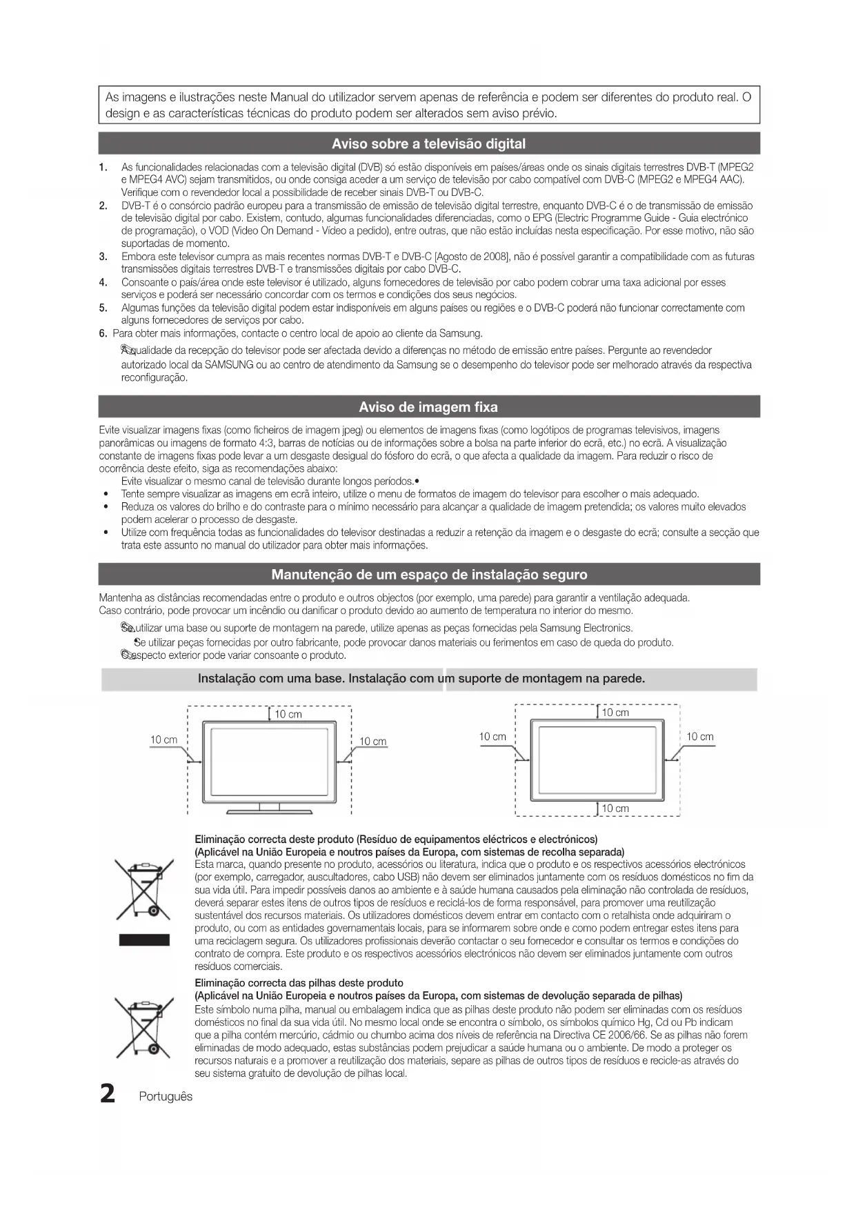 autorizado local da SAMSUNG ou ao centro de atendimento da Samsung se o desempenho do televisor pode ser melhorado através da respectiva reconfiguração. Aviso de imagem fixa Evite visualizar imagens fixas (como ficheiros de imagem jpeg) ou elementos de imagens fixas (como logótipos de programas televisivos, imagens panorâmicas ou imagens de formato 4:3, barras de notícias ou de informações sobre a bolsa na parte inferior do ecrã, etc.) no ecrã. A visualização constante de imagens fixas pode levar a um desgaste desigual do fósforo do ecrã, o que afecta a qualidade da imagem. Para reduzir o risco de ocorrência deste efeito, siga as recomendações abaixo: Evite visualizar o mesmo canal de televisão durante longos períodos.• Tente sempre visualizar as imagens em ecrã inteiro, utilize o menu de formatos de imagem do televisor para escolher o mais adequado.• Reduza os valores do brilho e do contraste para o mínimo necessário para alcançar a qualidade de imagem pretendida; os valores muito elevados • podem acelerar o processo de desgaste. Utilize com frequência todas as funcionalidades do televisor destinadas a reduzir a retenção da imagem e o desgaste do ecrã; consulte a secção que • trata este assunto no manual do utilizador para obter mais informações. Manutenção de um espaço de instalação seguro Mantenha as distâncias recomendadas entre o produto e outros objectos (por exemplo, uma parede) para garantir a ventilação adequada. Caso contrário, pode provocar um incêndio ou danificar o produto devido ao aumento de temperatura no interior do mesmo. Se utilizar uma base ou suporte de montagem na parede, utilize apenas as peças fornecidas pela Samsung Electronics.