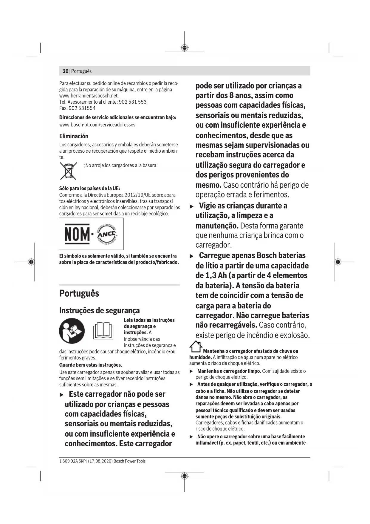 – 4,0Ah min 23 / 37 – 5,0Ah min 28 / 47 – 6,0Ah min 32 / 57 Mais tempos de carga em www.bosch-professional.com Número de elementos da bateria 4–15 Peso conforme EPTA-Procedure01:2014 kg 1,8 Classe de proteção / II A) depende da temperatura e do tipo de bateria B) Nível de carga da bateria aprox. 80%. A bateria pode ser retirada para uso imediato. C) Nível de carga da bateria 95%–100%. Funcionamento Colocação em funcionamento u Observar a tensão de rede! A tensão da fonte de corrente deve coincidir com a chapa de identificação do carregador. Os carregadores assinalados com 230V podem também ser operados com 220V. Processo de carregamento As baterias (1) são carregadas sucessivamente em dois ciclos de carga. – No primeiro ciclo de carga é feito o carregamento de todas as baterias colocadas até aprox.80% da capacidade. – No segundo ciclo de carga é feito o carregamento de aprox.80% até aprox.100% da capacidade. O segundo ciclo de carga começa quando todas as baterias colocadas estiverem carregadas até aprox.80%. Certificar-se de que todos os compartimentos de carga (2) e contactos da bateria estão isentos de sujidade maior. Certificar-se de que todas as baterias estão totalmente inseridas. Bosch Power Tools 1 609 92A 5KP | (17.08.2020)22 | Português O processo de carga começa assim que a ficha de rede estiver inserida e estiver colocada uma bateria. Se o processo de carga for iniciado com várias baterias em simultâneo, estas serão carregadas sucessivamente no sentido da seta impressa (6) (no sentido contrário ao dos ponteiros do relógio). Se a bateria tiver um nível de carga superior a aprox.80%, salta o primeiro ciclo de carga e é carregada no segundo ciclo de carga (de aprox.80% até aprox.100%). Se, durante o segundo ciclo de carga (de aprox.80% até aprox.100%), for colocada uma segunda bateria com nível de carga inferior a aprox.80%, esta é carregada imediatamente. Depois de esta bateria estar carregada a aprox.80%, a sequência é redefinida. A próxima bateria a ser carregada no segundo ciclo de carga (de aprox.80% a aprox.100%) segue a sequência da seta (6) no carregador (no sentido contrário ao dos ponteiros do relógio). Com o processo de carga inteligente, o estado de carga da bateria é reconhecido automaticamente e a bateria é carregada de acordo com a temperatura e com a tensão da bateria, com a corrente de carga ideal. Desta forma a bateria é poupada e permanece completamente carregada, mesmo durante a arrecadação no carregador. Nota: O carregamento rápido só é possível se a temperatura da bateria se encontrar na faixa de temperatura de carga permitida, ver secção "Dados técnicos". Tecla Prio (Priority Start) (3) Em cada compartimento de carga (2) existe uma tecla Prio (3) para o início imediato do processo de carga nesse compartimento de carga. – Após premir uma vez a tecla Prio (3) a bateria nesse compartimento de carga é priorizada a carregar até aprox.80% da sua capacidade (primeiro ciclo de carga). No início do processo de carga, os primeiros quatro LEDs do indicador do nível de carga da bateria (4) acendem-se por breves momentos. Quando a bateria estiver carregada até aprox.80%, é carregada a bateria seguinte no sentido da seta (6) (no sentido contrário ao dos ponteiros do relógio). – Após premir duas vezes a tecla Prio (3) a bateria nesse compartimento de carga é priorizada a carregar até aprox.100%. No início do processo de carga, os cinco LEDs do indicador do nível de carga da bateria (4) acendem-se por breves momentos. No fim deste processo de carga, continuam a ser carregadas as outras baterias até aprox.80%. Quando uma bateria (1) tiver sido carregada totalmente com prioridade, passa-se à bateria no compartimento de carga seguinte. A sequência do carregamento é feita no sentido da seta impressa (6) no carregador (no sentido dos ponteiros do relógio). Significado dos elementos de indicação Indicador do nível de carga da bateria verde (4) Ao colocar a bateria (1) o respetivo indicador do nível de carga da bateria (4) indica o nível de carga da bateria. Durante o carregamento, os LEDs acesos permanentemente a autonomia da bateria carregada. Os LEDs a piscar sucessivamente (evolução) indicam a capacidade na bateria que está a ser carregada. O indicador de nível de carga de LED é válido para a bateria (1) durante e após o processo de carga. LED de estado Capacidade da bateria, aprox. O primeiro LED acende-se permanentemente. ≥20% Os primeiros dois LEDs acendem-se permanentemente. ≥40% Os primeiros três LEDs acendem-se permanentemente. ≥60% Os primeiros quatro LEDs acendem- se permanentemente. ≥80% Os cinco LEDs acendem-se permanentemente. >95% Nota: O carregamento rápido só é possível se a temperatura da bateria se encontrar na faixa de temperatura de carga permitida, ver secção "Dados técnicos". No modo standby do compartimento de carga (2) o primeiro LED do respetivo indicador do nível de carga da bateria (4) acende-se permanentemente a verde. Indicação vermelha da monitorização de temperatura/ erro (5) Luz permanente A luz permanente vermelha assinala que a temperatura da bateria se encontra fora da faixa de temperatura de carga permitida, ver secção "Dados técnicos". O carregamento inicia-se assim que a faixa de temperatura permitida seja alcançada. Luz intermitente A luz intermitente vermelha assinala que a bateria nesse compartimento de carga tem defeito. Seis luzes intermitentes vermelhas em simultâneo assinalam que o carregador tem defeito. Erros – Causas e soluções Causa Solução Indicação a vermelho da monitorização da temperatura/ erro (5) pisca (um de cada vez no compartimento de carga) Nenhum processo de carga possível Bateria não inserida (corretamente) Inserir corretamente a bateria no carregador 1 609 92A 5KP | (17.08.2020) Bosch Power ToolsPortuguês | 23 Causa Solução Contactos da bateria e de carga sujos Limpar os con