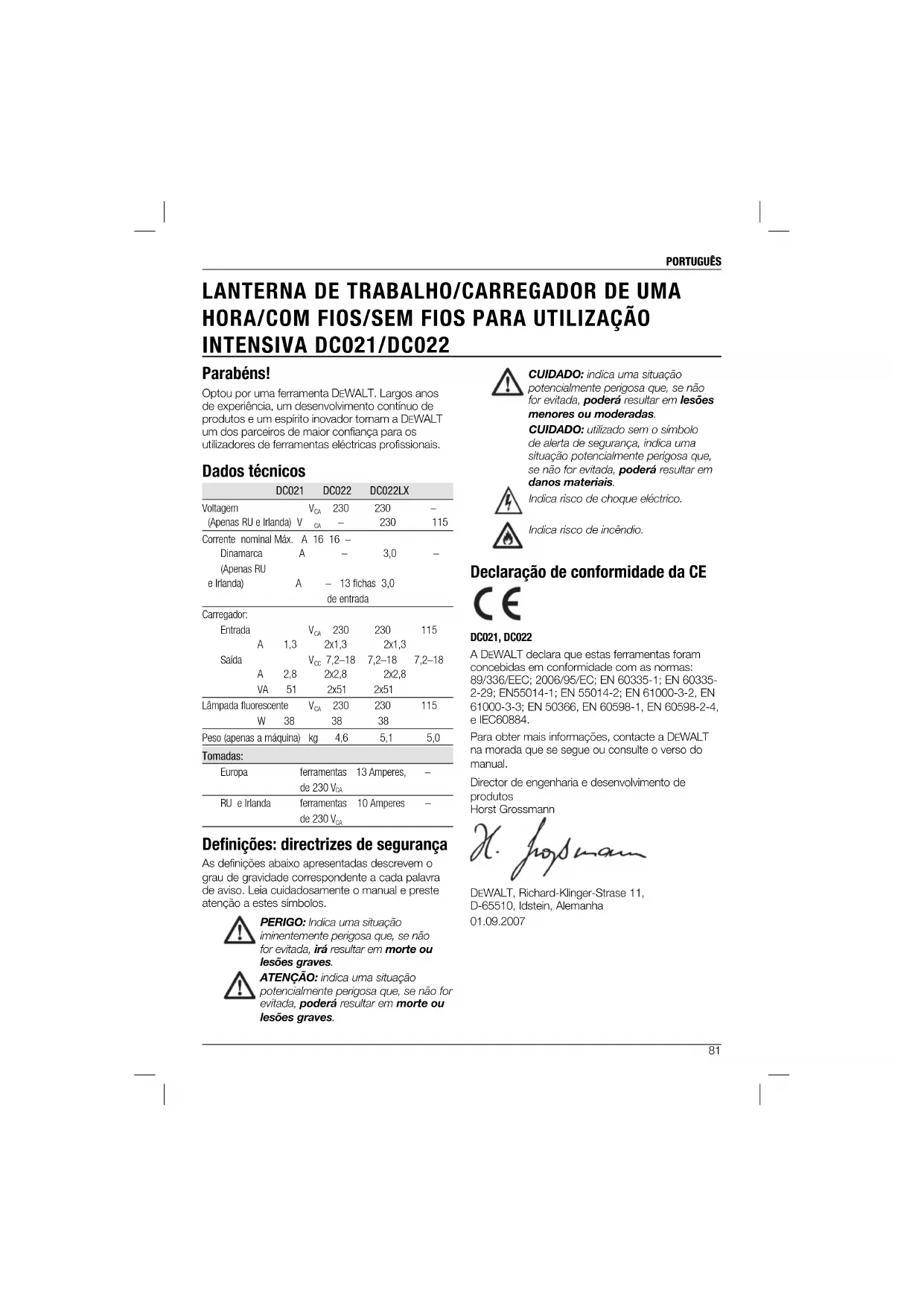 2-29; EN55014-1; EN 55014-2; EN 61000-3-2, EN 61000-3-3; EN 50366, EN 60598-1, EN 60598-2-4, e IEC60884. Para obter mais informações, contacte a DEWALT na morada que se segue ou consulte o verso do manual. Director de engenharia e desenvolvimento de produtos Horst Grossmann DEWALT, Richard-Klinger-Strase 11, D-65510, Idstein, Alemanha