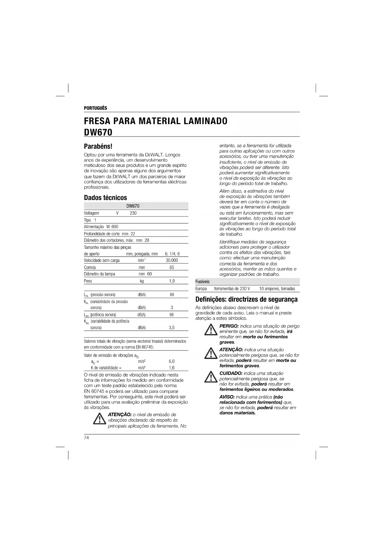 m/s² 6,0 K de variabilidade = m/s² 1,6 O nível de emissão de vibrações indicado nesta ficha de informações foi medido em conformidade com um teste padrão estabelecido pela norma EN 60745 e poderá ser utilizado para comparar ferramentas. Por conseguinte, este nível poderá ser utilizado para uma avaliação preliminar da exposição às vibrações. ATENÇÃO: o nível de emissão de vibrações declarado diz respeito às principais aplicações da ferramenta. No entanto, se a ferramenta for utilizada para outras aplicações ou com outros acessórios, ou tiver uma manutenção insuficiente, o nível de emissão de vibrações poderá ser diferente. Isto poderá aumentar significativamente o nível de exposição às vibrações ao longo do período total de trabalho. Além disso, a estimativa do nível de exposição às vibrações também deverá ter em conta o número de vezes que a ferramenta é desligada ou está em funcionamento, mas sem executar tarefas. Isto poderá reduzir significativamente o nível de exposição às vibrações ao longo do período total de trabalho. Identifique medidas de segurança adicionais para proteger o utilizador contra os efeitos das vibrações, tais como: efectuar uma manutenção correcta da ferramenta e dos acessórios, manter as mãos quentes e organizar padrões de trabalho. Fusíveis Europa ferramentas de 230 V 10 amperes, tomadas Defi nições: directrizes de segurança As definições abaixo descrevem o nível de gravidade de cada aviso. Leia o manual e preste atenção a estes símbolos. PERIGO: indica uma situação de perigo eminente que, se não for evitada, irá resultar em morte ou ferimentos graves. ATENÇÃO: indica uma situação potencialmente perigosa que, se não for evitada, poderá resultar em morte ou ferimentos graves. CUIDADO: indica uma situação potencialmente perigosa que, se não for evitada, poderá resultar em ferimentos ligeiros ou moderados. AVISO: indica uma prática (não relacionada com ferimentos) que, se não for evitada, poderá resultar em danos materiais.PORTUGUÊS
