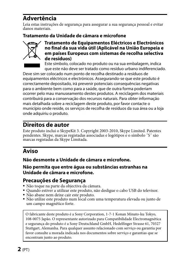Não toque na parte da objectiva da câmara. Quando estiver a utilizar este produto, não desligue o cabo USB do televisor. Não abane nem deixe cair este produto. Não utilize este produto num local com uma temperatura elevada ou junto de um campo magnético forte. O fabricante deste produto é a Sony Corporation, 1-7-1 Konan Minato-ku Tokyo, 108-0075 Japão. O representante autorizado para Compatibilidade Electromagnética e segurança do produto é a Sony Deutschland GmbH, Hedelfinger Strasse 61, 70327 Stuttgart, Alemanha. Para qualquer assunto relacionado com serviço ou garantia por favor consulte a morada indicada nos documentos sobre serviço e garantias que se encontram junto ao produto. (PT)