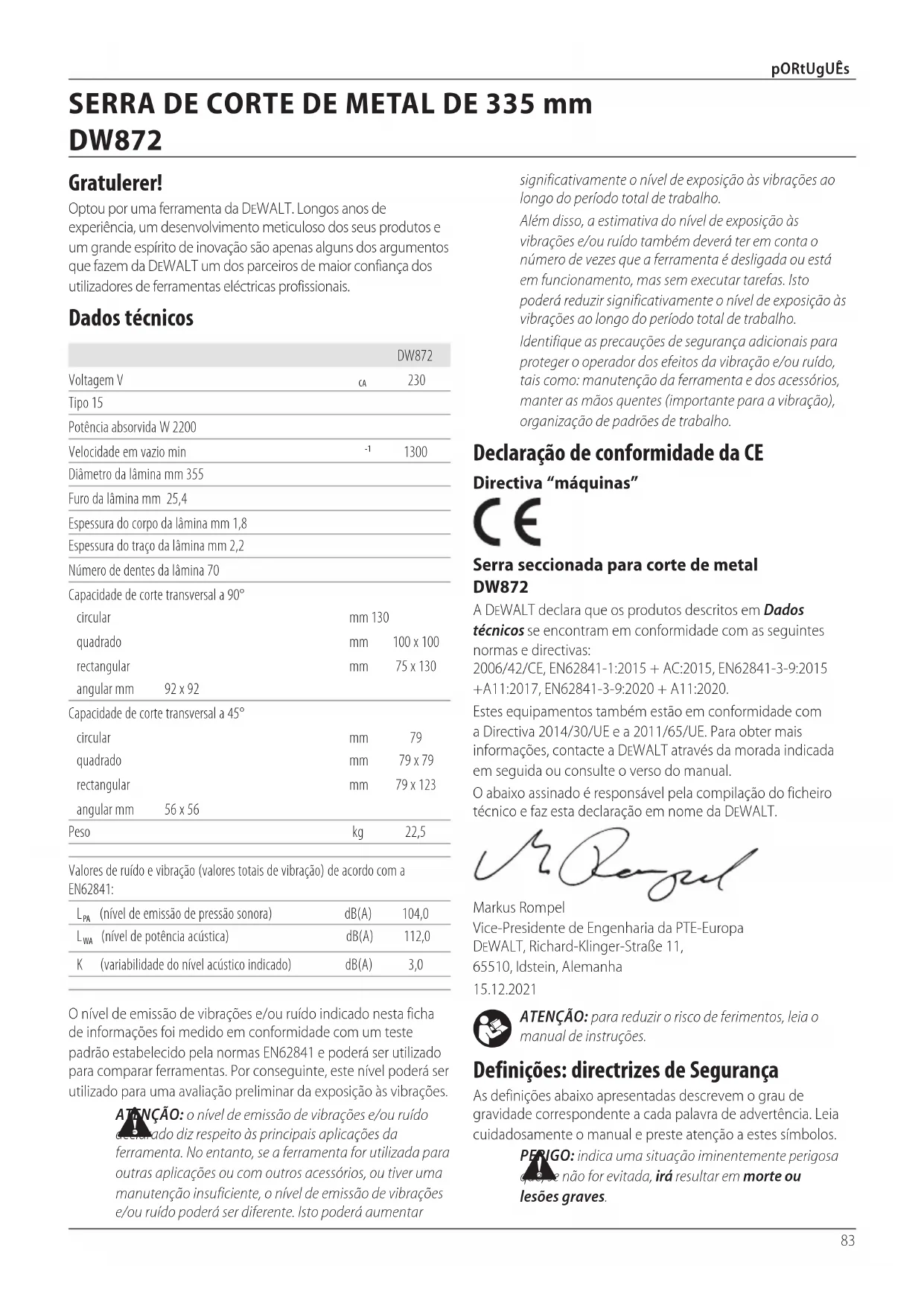 ADVARSEL: Bruk av annet tilleggsutstyr enn det som tilbys av DeWALT kan være farlig, ettersom dette ikke er testet sammen med dette verktøyet. For å redusere faren for skader, bør kun tilleggsutstyr som er anbefalt av DeWALT brukes sammen med detteproduktet. Ta kontakt med din forhandler for ytterligere informasjon om egnetekstrautstyr. Beskyttelse av miljøet Separat innsamling. Produkter og batterier merket med dette symbolet skal ikke kastes i vanlighusholdningsavfall. Produkter og batterier inneholder materialer som kan gjenvinnes eller gjenbrukes, som reduserer behovet for råmaterialer. Vennligst lever elektriske produkter og batterier til gjenbruk i henhold til lokale regler. Mer informasjon får du på www.2helpU.com.83 pORtUgUês ATENÇÃO: para reduzir o risco de ferimentos, leia o manual deinstruções. Definições: directrizes de Segurança As definições abaixo apresentadas descrevem o grau de gravidade correspondente a cada palavra de advertência. Leia cuidadosamente o manual e preste atenção a estessímbolos. PERIGO: indica uma situação iminentemente perigosa que, se não for evitada, irá resultar em morte ou lesõesgraves. Declaração de conformidade da CE Directiva “máquinas” Serra seccionada para corte de metal DW872 A DeWALT declara que os produtos descritos em Dados técnicos se encontram em conformidade com as seguintes normas e directivas: 2006/42/CE, EN62841-1:2015 + AC:2015, EN62841-3-9:2015 +A11:2017, EN62841-3-9:2020 + A11:2020.Estes equipamentos também estão em conformidade com a Directiva 2014/30/UE e a 2011/65/UE. Para obter mais informações, contacte a DeWALT através da morada indicada em seguida ou consulte o verso domanual.O abaixo assinado é responsável pela compilação do ficheiro técnico e faz esta declaração em nome daDeWALT.Markus Rompel Vice-Presidente de Engenharia da PTE-Europa DeWALT, Richard-Klinger-Straße 11, 65510, Idstein, Alemanha15.12.2021O nível de emissão de vibrações e/ou ruído indicado nesta ficha de informações foi medido em conformidade com um teste padrão estabelecido pela normas EN62841 e poderá ser utilizado para comparar ferramentas. Por conseguinte, este nível poderá ser utilizado para uma avaliação preliminar da exposição àsvibrações. ATENÇÃO: o nível de emissão de vibrações e/ou ruído declarado diz respeito às principais aplicações da ferramenta. No entanto, se a ferramenta for utilizada para outras aplicações ou com outros acessórios, ou tiver uma manutenção insuficiente, o nível de emissão de vibrações e/ou ruído poderá ser diferente. Isto poderá aumentar DW872Voltagem V