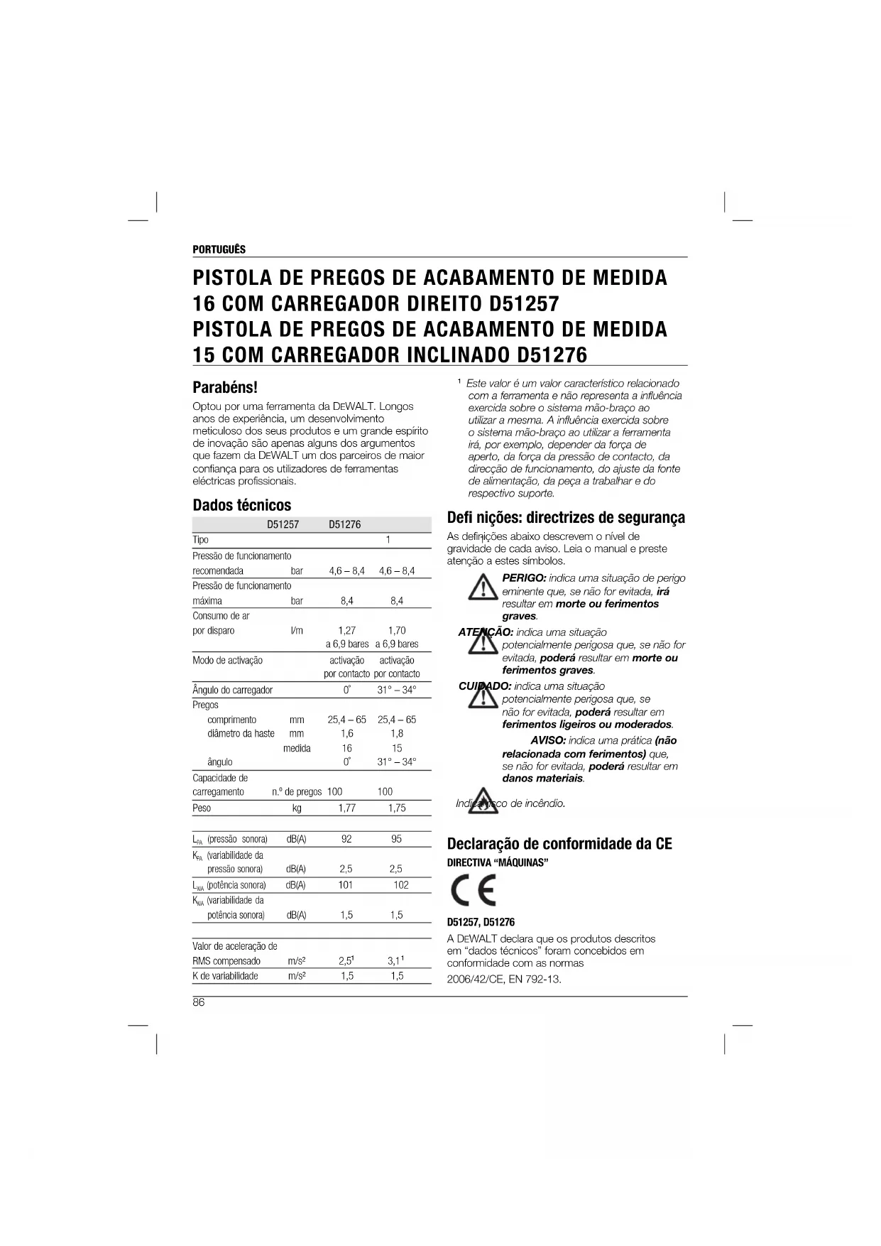 D51257, D51276 A DEWALT declara que os produtos descritos em “dados técnicos” foram concebidos em conformidade com as normas 2006/42/CE, EN 792-13. Parabéns! Optou por uma ferramenta da DEWALT. Longos anos de experiência, um desenvolvimento meticuloso dos seus produtos e um grande espírito de inovação são apenas alguns dos argumentos que fazem da DEWALT um dos parceiros de maior confiança para os utilizadores de ferramentas eléctricas profissionais. Dados técnicos D51257 D51276 Tipo 1 1 Pressão de funcionamento recomendada bar 4,6 – 8,4 4,6 – 8,4 Pressão de funcionamento máxima bar 8,4 8,4 Consumo de ar por disparo l/m 1,27 1,70 a 6,9 bares a 6,9 bares Modo de activação activação activação por contacto por contacto Ângulo do carregador 0˚ 31° – 34° Pregos comprimento mm 25,4 – 65 25,4 – 65 diâmetro da haste mm 1,6 1,8 medida 16 15 ângulo 0˚ 31° – 34° Capacidade de carregamento n.º de pregos 100 100 Peso kg 1,77 1,75