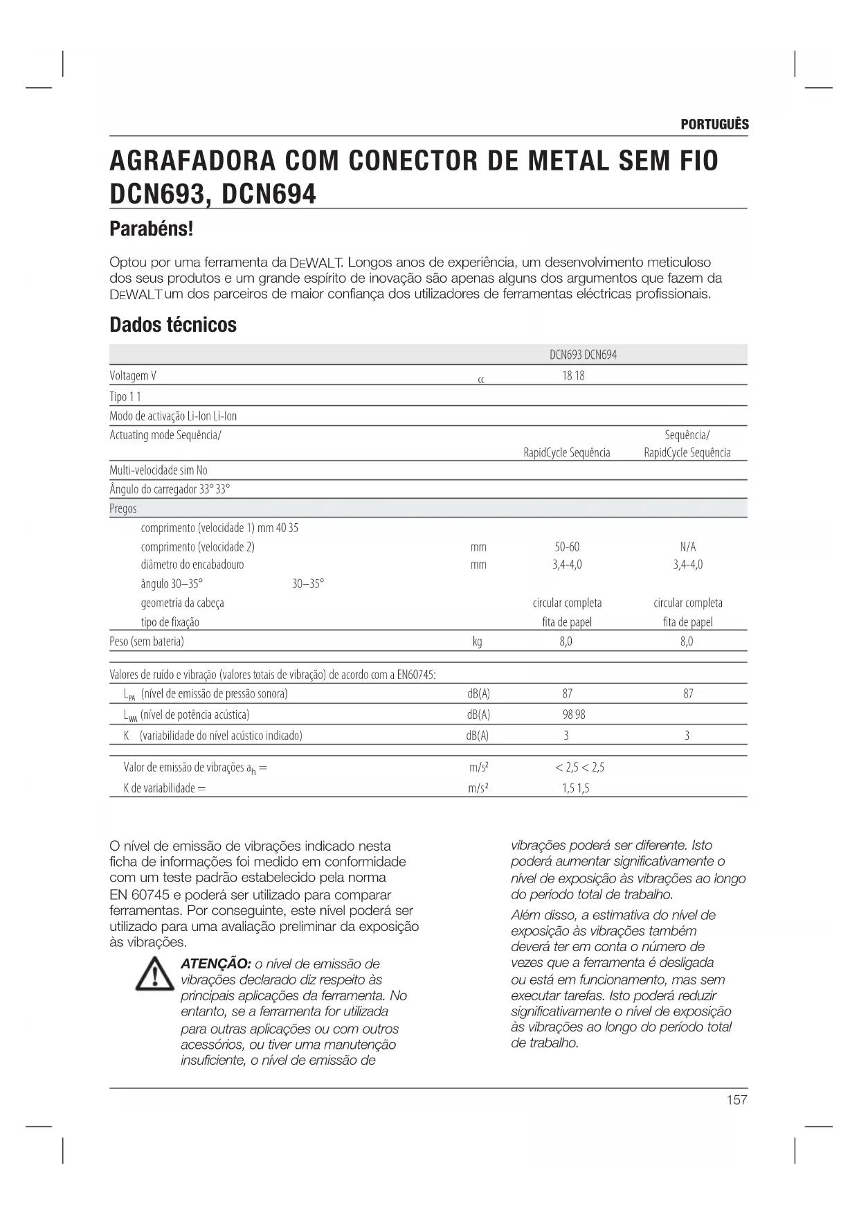 reparasjonsverksted.157 português Optou por uma ferramenta da DeWALT . Longos anos de experiência, um desenvolvimento meticuloso dos seus produtos e um grande espírito de inovação são apenas alguns dos argumentos que fazem da DeWALT um dos parceiros de maior confiança dos utilizadores de ferramentas eléctricas profissionais. Dados técnicos DCN693 DCN694 Voltagem V