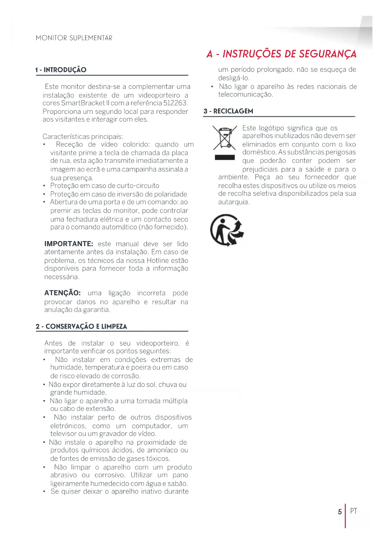 Este posto de resposta interno com teclas sensíveis permite ver e comunicar com os visitantes que tocaram à campainha, tal como o monitor do videoporteiro SmartBracket ll para o qual o produto foi concebido. A instalação do videoporteiro é fácil, com apenas 2 os para todas as funções (campainha, vídeo, intercomunicador, comandos do trinco e do automatismo). Para uma utilização ecaz, leia atentamente o manual de instruções fornecido com o videoporteiro a cores SmartBracket ll com a referência 512263.