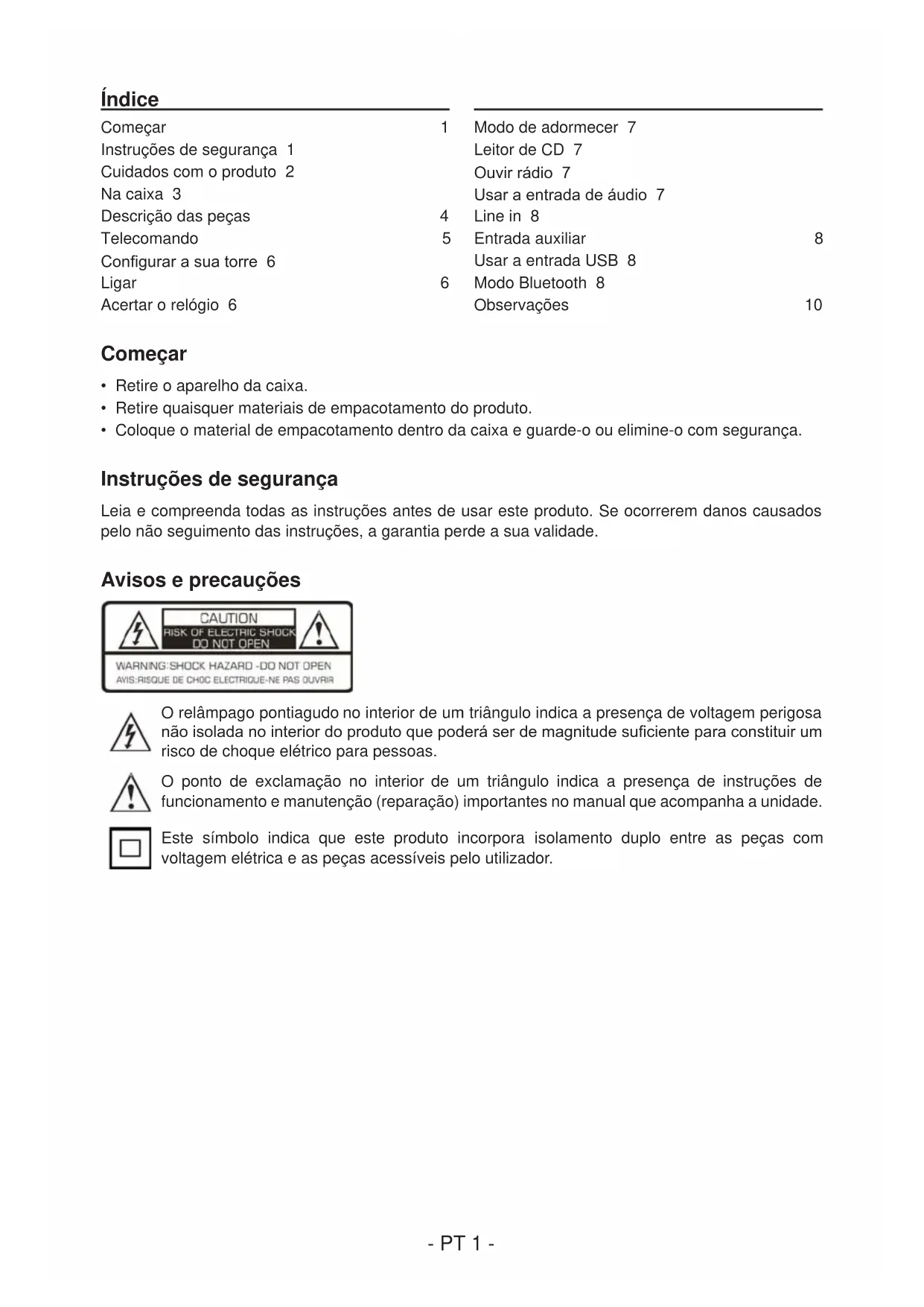 BBI_DS500_1508 _Ver2- PT 1 - Índice Começar 1 Instruções de segurança 1 Cuidados com o produto 2 Na caixa 3 Descrição das peças