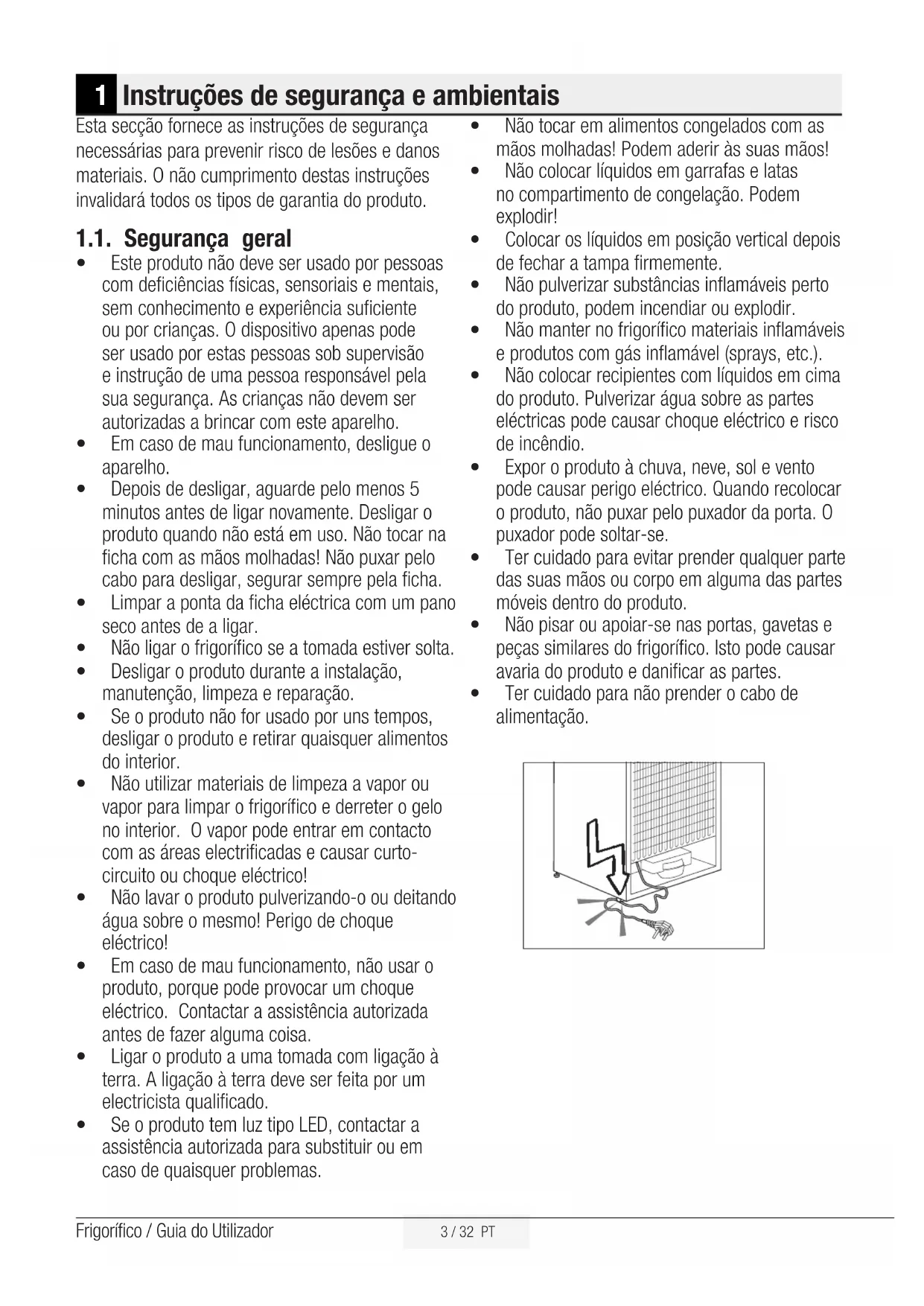 Risco de choque eléctrico. A embalagem do produto é fe- ita com materiais recicláveis, de acordo com a Legislação Ambiental Nacional.2 / 32 PT Frigorífico / Guia do Utilizador 1 Instruções de segurança e ambientais 3 1.1. Segurança geral . . . . . . . . . . . . . . . . . . . . . 3
