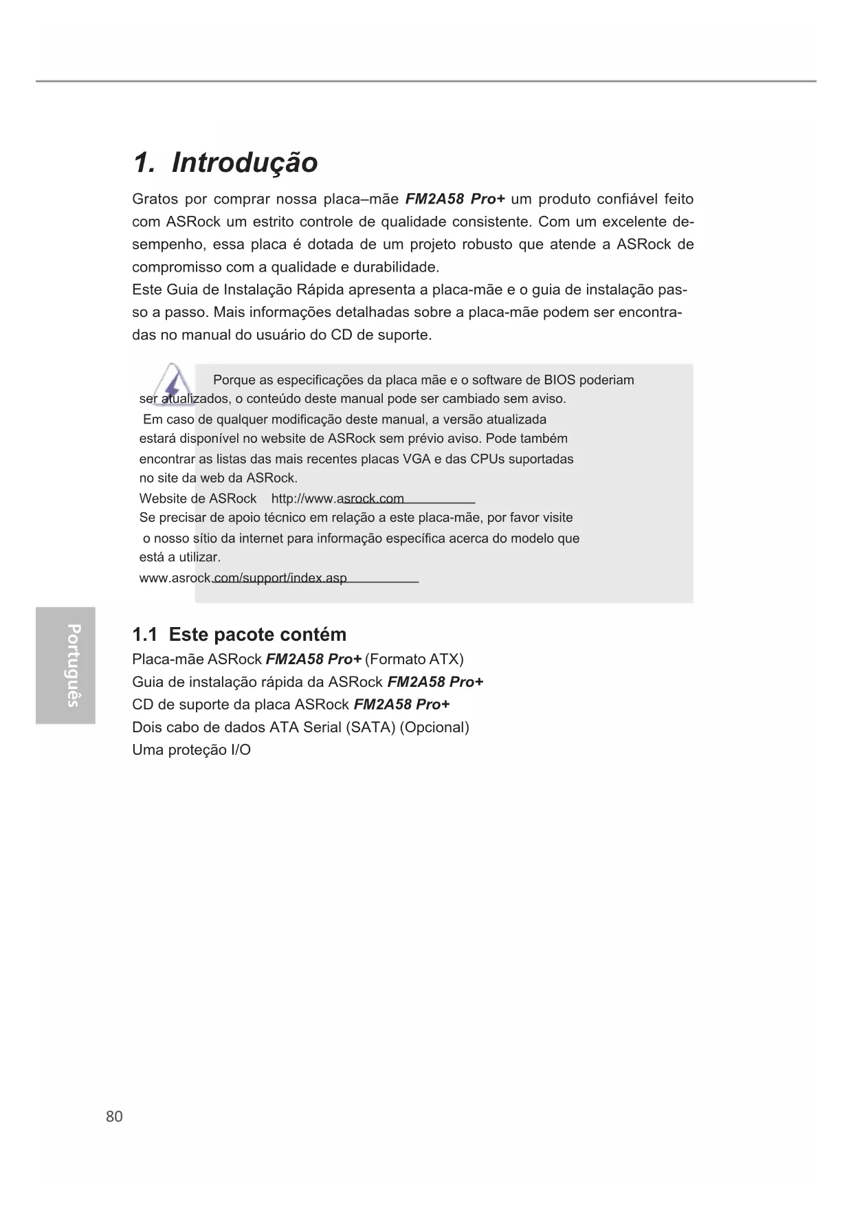 Placa-mãe ASRock FM2A58 Pro+ (Formato ATX) Guia de instalação rápida da ASRock FM2A58 Pro+ CD de suporte da placa ASRock FM2A58 Pro+ Dois cabo de dados ATA Serial (SATA) (Opcional) Uma proteção I/O81 Português FM2A58 Pro+