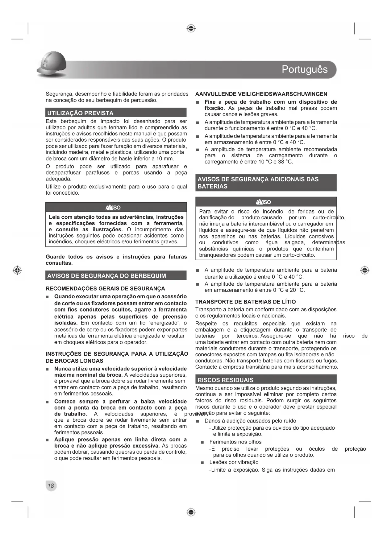 Ŷ Nunca utilize uma velocidade superior à velocidade máxima nominal da broca. A velocidades superiores, pSURYiYHOTXHDEURFDGREUHVHURGDUOLYUHPHQWHVHP entrar em contacto com a peça de trabalho, resultando em ferimentos pessoais. Ŷ Comece sempre a perfurar a baixa velocidade com a ponta da broca em contacto com a peça de trabalho. $ YHORFLGDGHV VXSHULRUHV p SURYiYHO que a broca dobre se rodar livremente sem entrar em contacto com a peça de trabalho, resultando em ferimentos pessoais. Ŷ Aplique pressão apenas em linha direta com a broca e não aplique pressão excessiva. As brocas podem dobrar, causando quebras ou perda de controlo, o que pode resultar em ferimentos pessoais. AANVULLENDE VEILIGHEIDSWAARSCHUWINGEN Ŷ Fixe a peça de trabalho com um dispositivo de fixação. As peças de trabalho mal presas podem causar danos e lesões graves. Ŷ A amplitude de temperatura ambiente para a ferramenta durante o funcionamento é entre 0 °C e 40 °C. Ŷ A amplitude de temperatura ambiente para a ferramenta em armazenamento é entre 0 °C e 40 °C. Ŷ A amplitude de temperatura ambiente recomendada para o sistema de carregamento durante o carregamento é entre 10 °C e 38 °C.