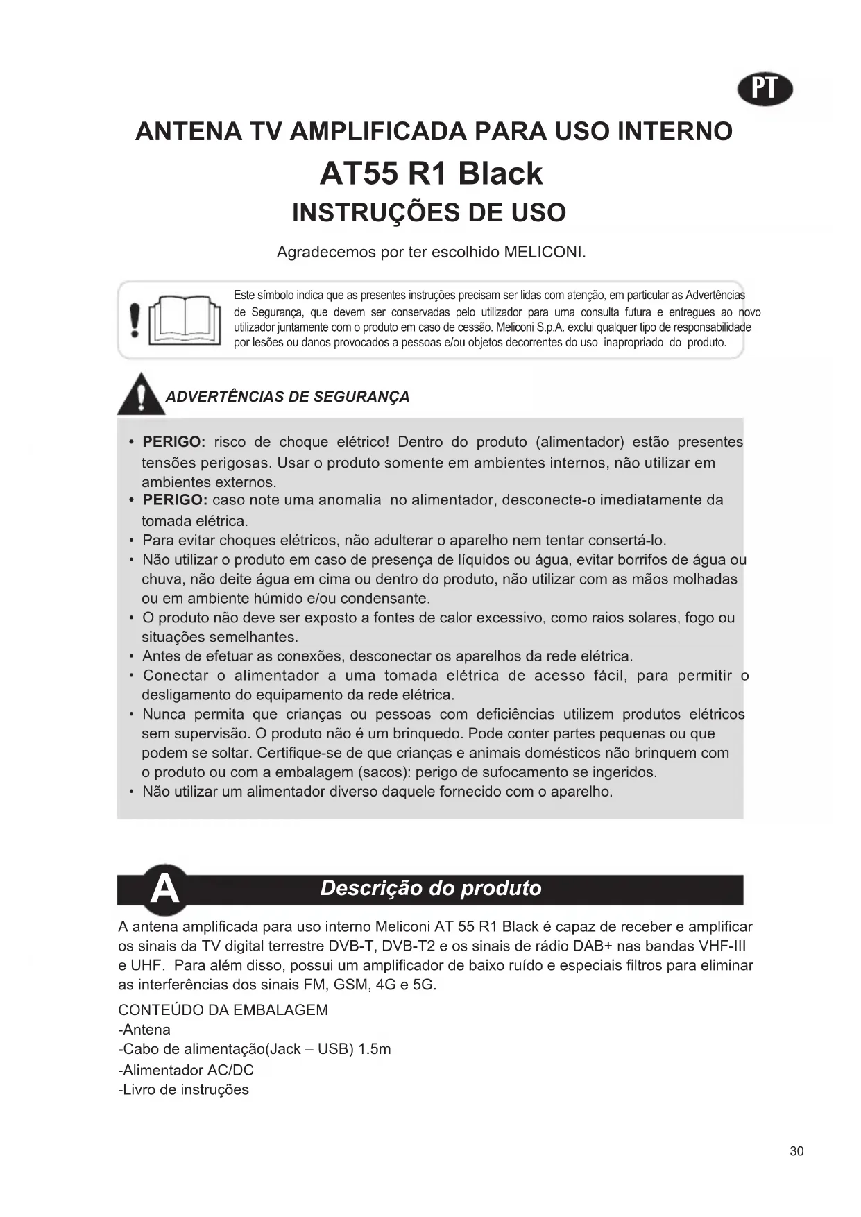 Agradecemos por ter escolhido MELICONI. A antena amplicada para uso interno Meliconi AT 55 R1 Black é capaz de receber e amplicar os sinais da TV digital terrestre DVB-T, DVB-T2 e os sinais de rádio DAB+ nas bandas VHF-III e UHF. Para além disso, possui um amplicador de baixo ruído e especiais ltros para eliminar as interferências dos sinais FM, GSM, 4G e 5G. CONTEÚDO DA EMBALAGEM -Antena -Cabo de alimentação(Jack – USB) 1.5m-Alimentador AC/DC -Livro de instruções