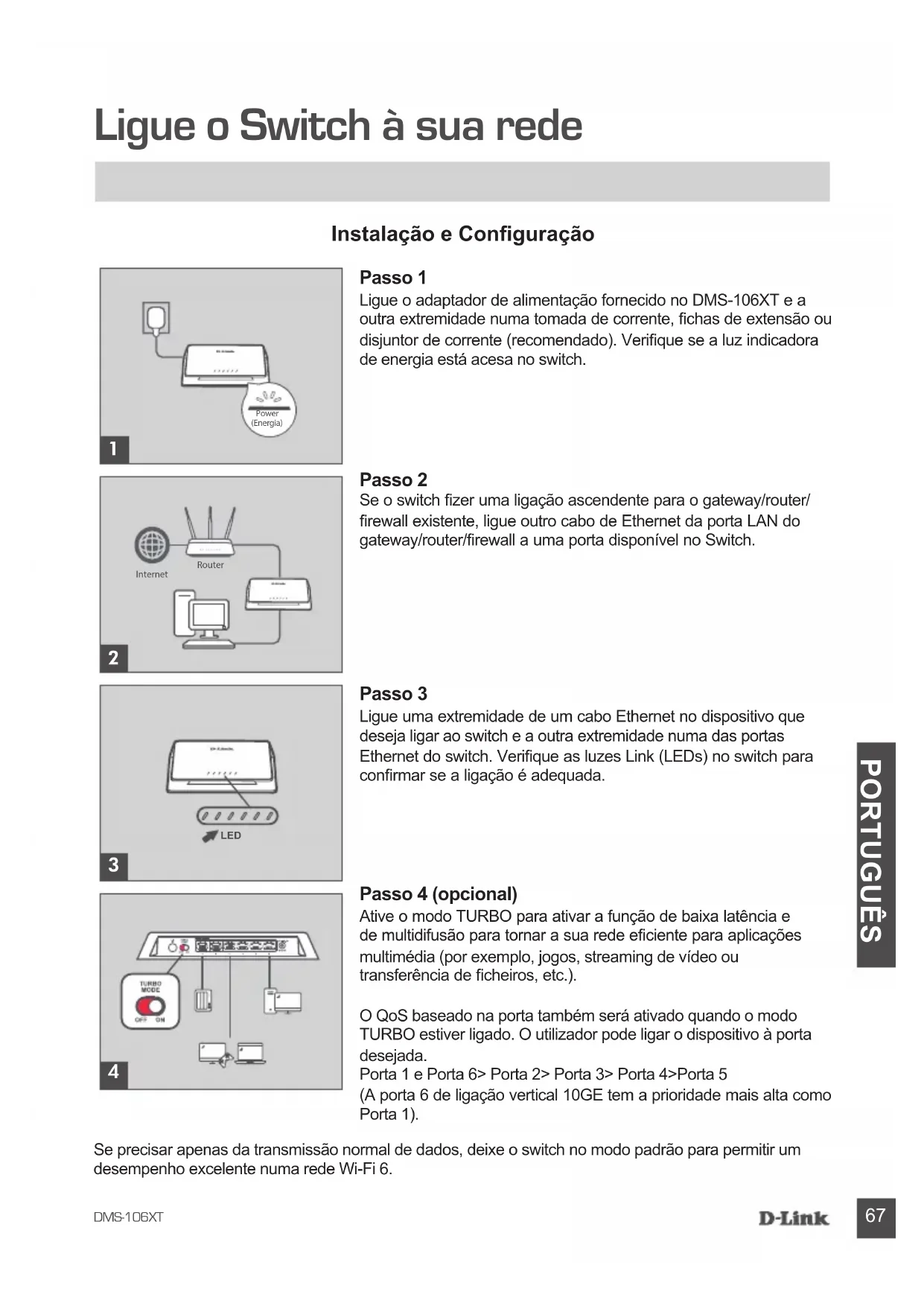 PORTUGUÊS Ligue o Switch à sua rede Se precisar apenas da transmissão normal de dados, deixe o switch no modo padrão para permitir um desempenho excelente numa rede Wi-Fi 6. Passo 1 Ligue o adaptador de alimentação fornecido no DMS-106XT e a outra extremidade numa tomada de corrente, chas de extensão ou disjuntor de corrente (recomendado). Verique se a luz indicadora de energia está acesa no switch. Passo 2 Se o switch zer uma ligação ascendente para o gateway/router/rewall existente, ligue outro cabo de Ethernet da porta LAN do gateway/router/rewall a uma porta disponível no Switch. Passo 3 Ligue uma extremidade de um cabo Ethernet no dispositivo que deseja ligar ao switch e a outra extremidade numa das portas Ethernet do switch. Verique as luzes Link (LEDs) no switch para conrmar se a ligação é adequada. Passo 4 (opcional) Ative o modo TURBO para ativar a função de baixa latência e de multidifusão para tornar a sua rede eciente para aplicações multimédia (por exemplo, jogos, streaming de vídeo ou transferência de cheiros, etc.). O QoS baseado na porta também será ativado quando o modo TURBO estiver ligado. O utilizador pode ligar o dispositivo à porta desejada. Porta 1 e Porta 6> Porta 2> Porta 3> Porta 4>Porta 5 (A porta 6 de ligação vertical 10GE tem a prioridade mais alta como Porta 1). Instalação e Conguração