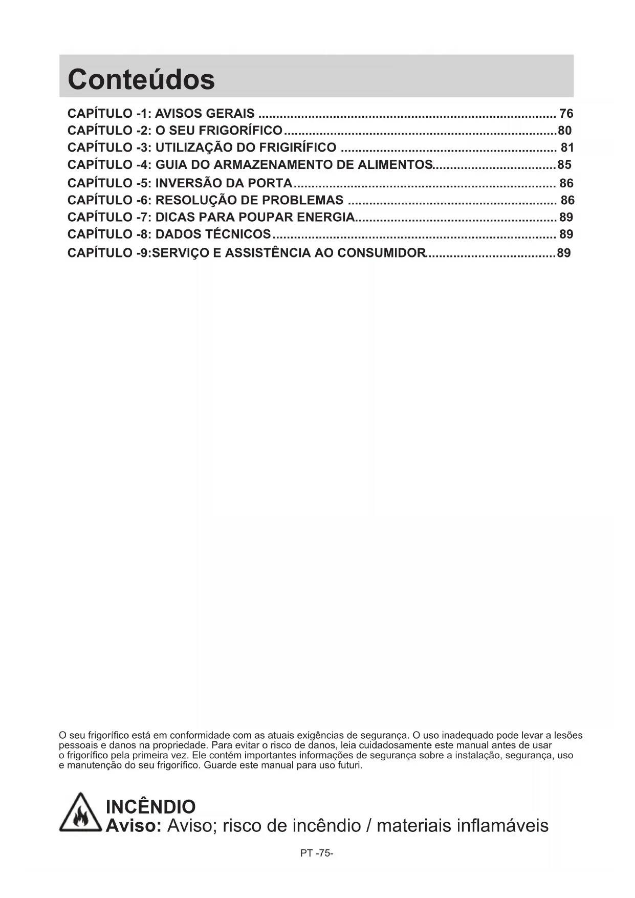 INCÊNDIO Aviso: Aviso; risco de incêndio / materiais inamáveisPT -76-