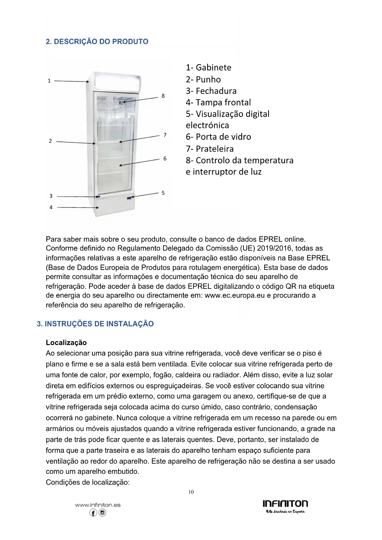 Localização Ao selecionar uma posição para sua vitrine refrigerada, você deve verificar se o piso é plano e firme e se a sala está bem ventilada. Evite colocar sua vitrine refrigerada perto de uma fonte de calor, por exemplo, fogão, caldeira ou radiador. Além disso, evite a luz solar direta em edifícios externos ou espreguiçadeiras. Se você estiver colocando sua vitrine refrigerada em um prédio externo, como uma garagem ou anexo, certifique-se de que a vitrine refrigerada seja colocada acima do curso úmido, caso contrário, condensação ocorrerá no gabinete. Nunca coloque a vitrine refrigerada em um recesso na parede ou em armários ou móveis ajustados quando a vitrine refrigerada estiver funcionando, a grade na parte de trás pode ficar quente e as laterais quentes. Deve, portanto, ser instalado de forma que a parte traseira e as laterais do aparelho tenham espaço suficiente para ventilação ao redor do aparelho. Este aparelho de refrigeração não se destina a ser usado como um aparelho embutido. Condições de localização: