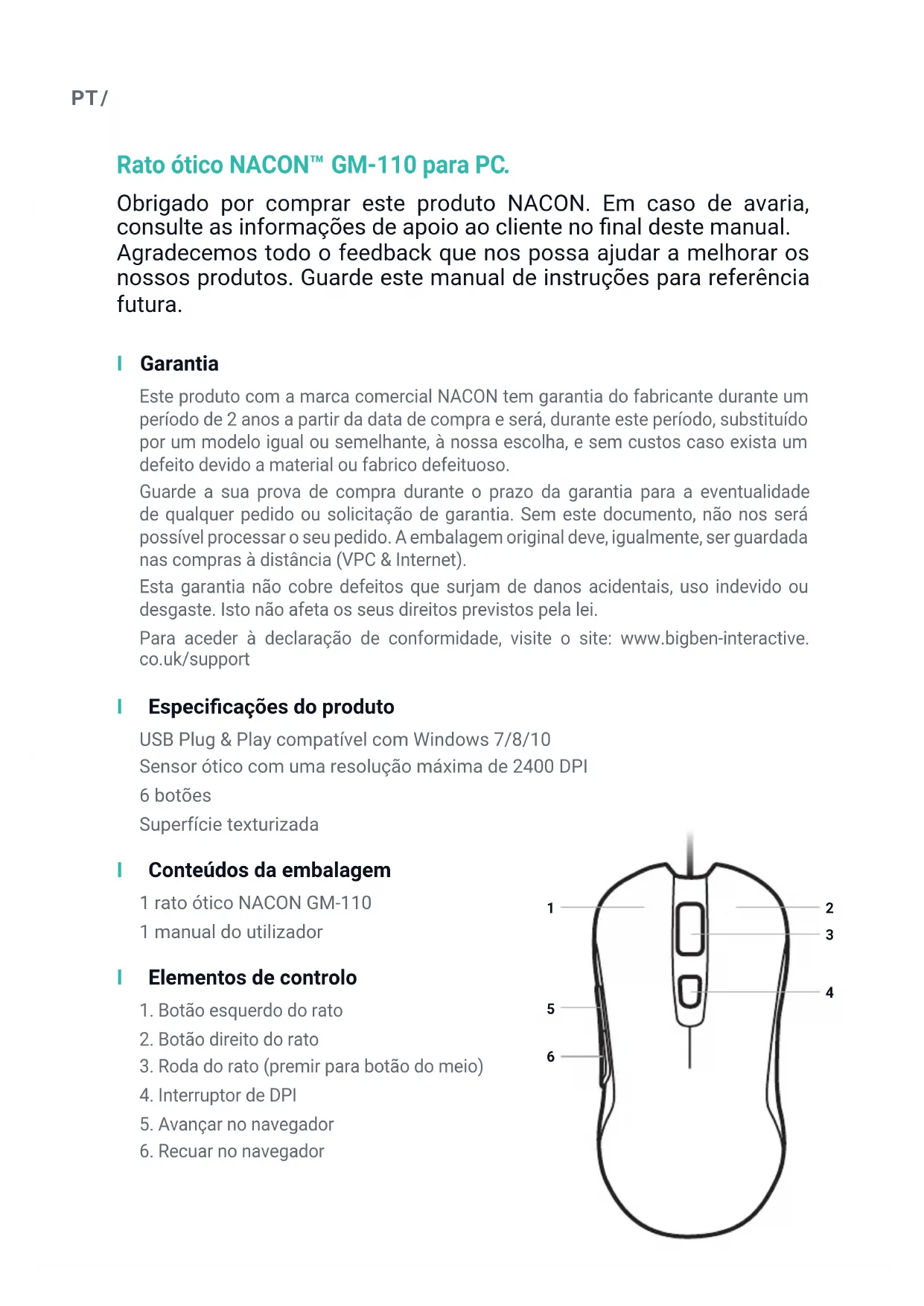 Obrigado por comprar este produto NACON. Em caso de avaria, consulte as informações de apoio ao cliente no nal deste manual. Agradecemos todo o feedback que nos possa ajudar a melhorar os nossos produtos. Guarde este manual de instruções para referência futura. I Garantia Este produto com a marca comercial NACON tem garantia do fabricante durante um período de 2 anos a partir da data de compra e será, durante este período, substituído por um modelo igual ou semelhante, à nossa escolha, e sem custos caso exista um defeito devido a material ou fabrico defeituoso. Guarde a sua prova de compra durante o prazo da garantia para a eventualidade de qualquer pedido ou solicitação de garantia. Sem este documento, não nos será possível processar o seu pedido. A embalagem original deve, igualmente, ser guardada nas compras à distância (VPC & Internet). Esta garantia não cobre defeitos que surjam de danos acidentais, uso indevido ou desgaste. Isto não afeta os seus direitos previstos pela lei. Para aceder à declaração de conformidade, visite o site: www.bigben-interactive. co.uk/support I Especicaçõesdoproduto USB Plug & Play compatível com Windows 7/8/10 Sensor ótico com uma resolução máxima de 2400 DPI 6 botões Superfície texturizada I Conteúdosdaembalagem 1 rato ótico NACON GM-110 1 manual do utilizador I Elementosdecontrolo