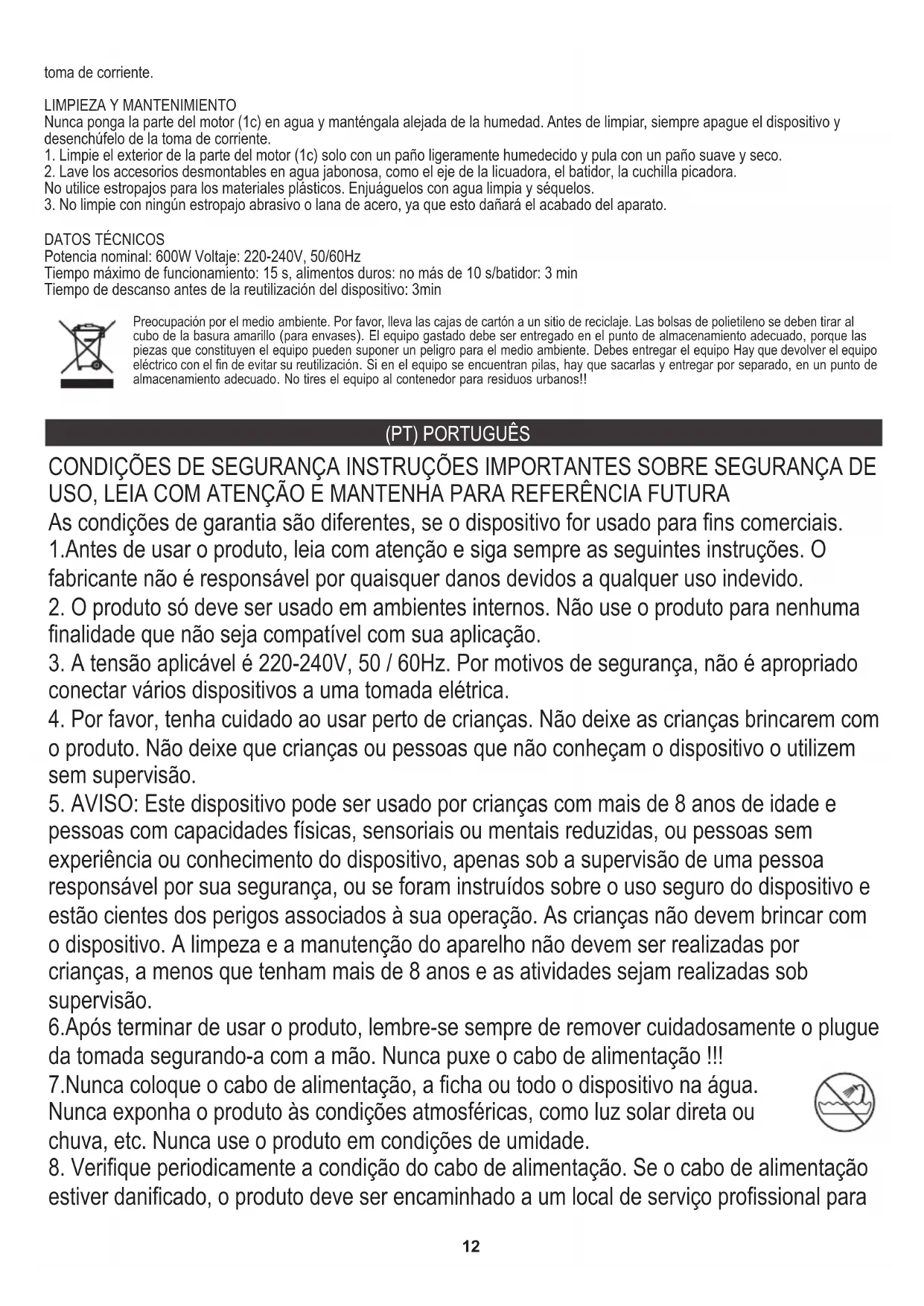 conectar vários dispositivos a uma tomada elétrica. 7.Nunca coloque o cabo de alimentação, a ficha ou todo o dispositivo na água. 1.Antes de usar o produto, leia com atenção e siga sempre as seguintes instruções. O fabricante não é responsável por quaisquer danos devidos a qualquer uso indevido.13 11.Nunca use o produto próximo a combustíveis.